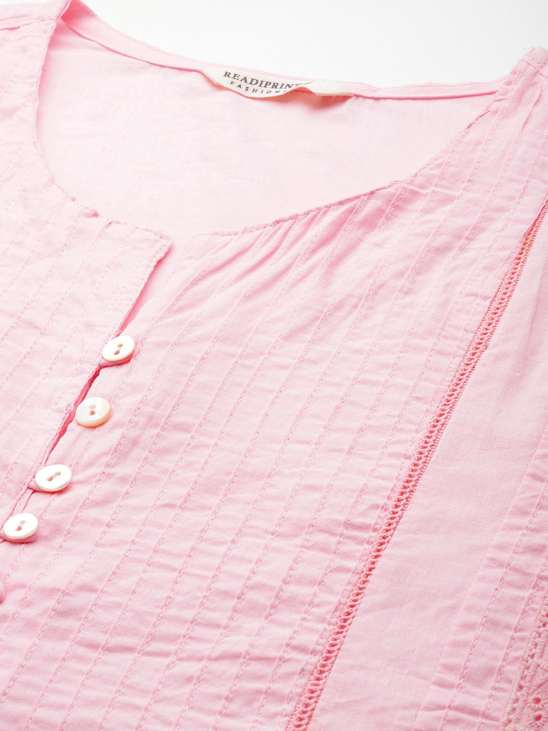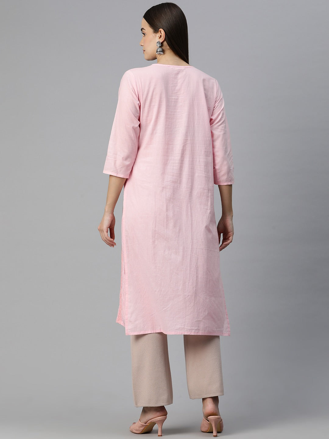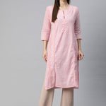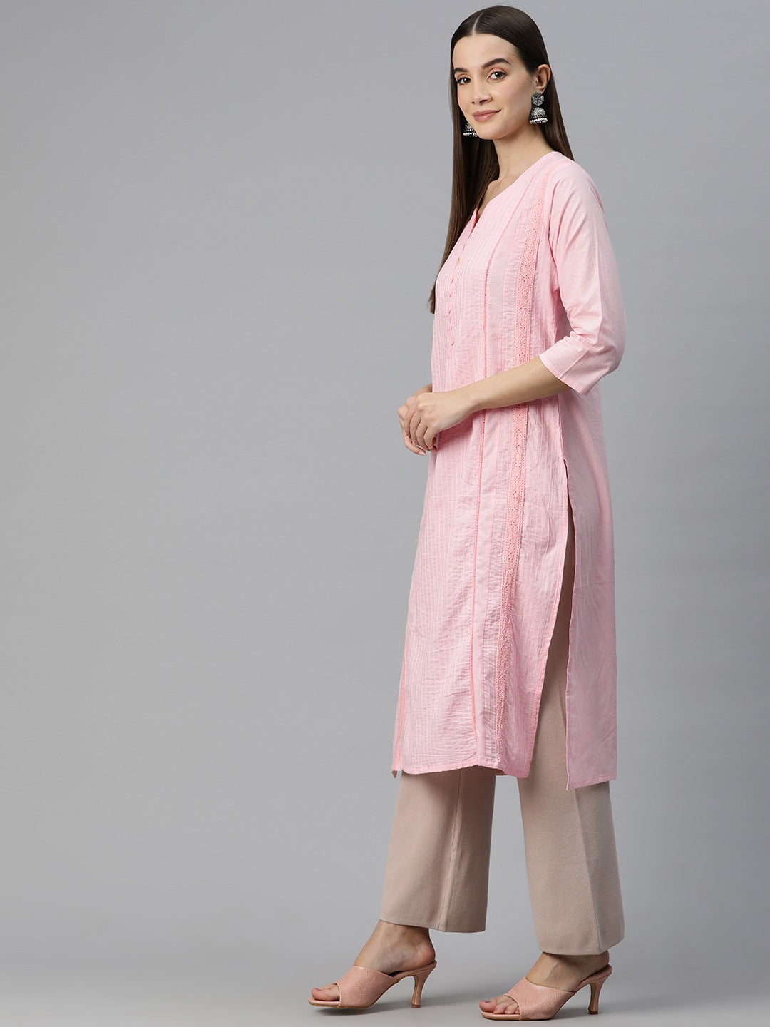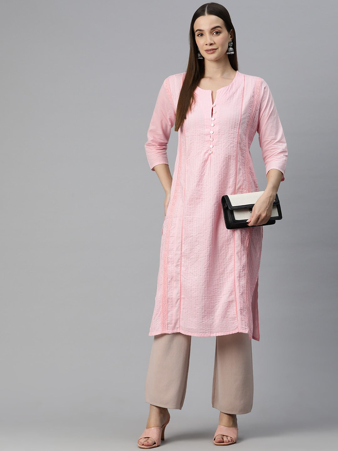Straight Style Cotton Fabric Peach Color Kurti With Lace Work