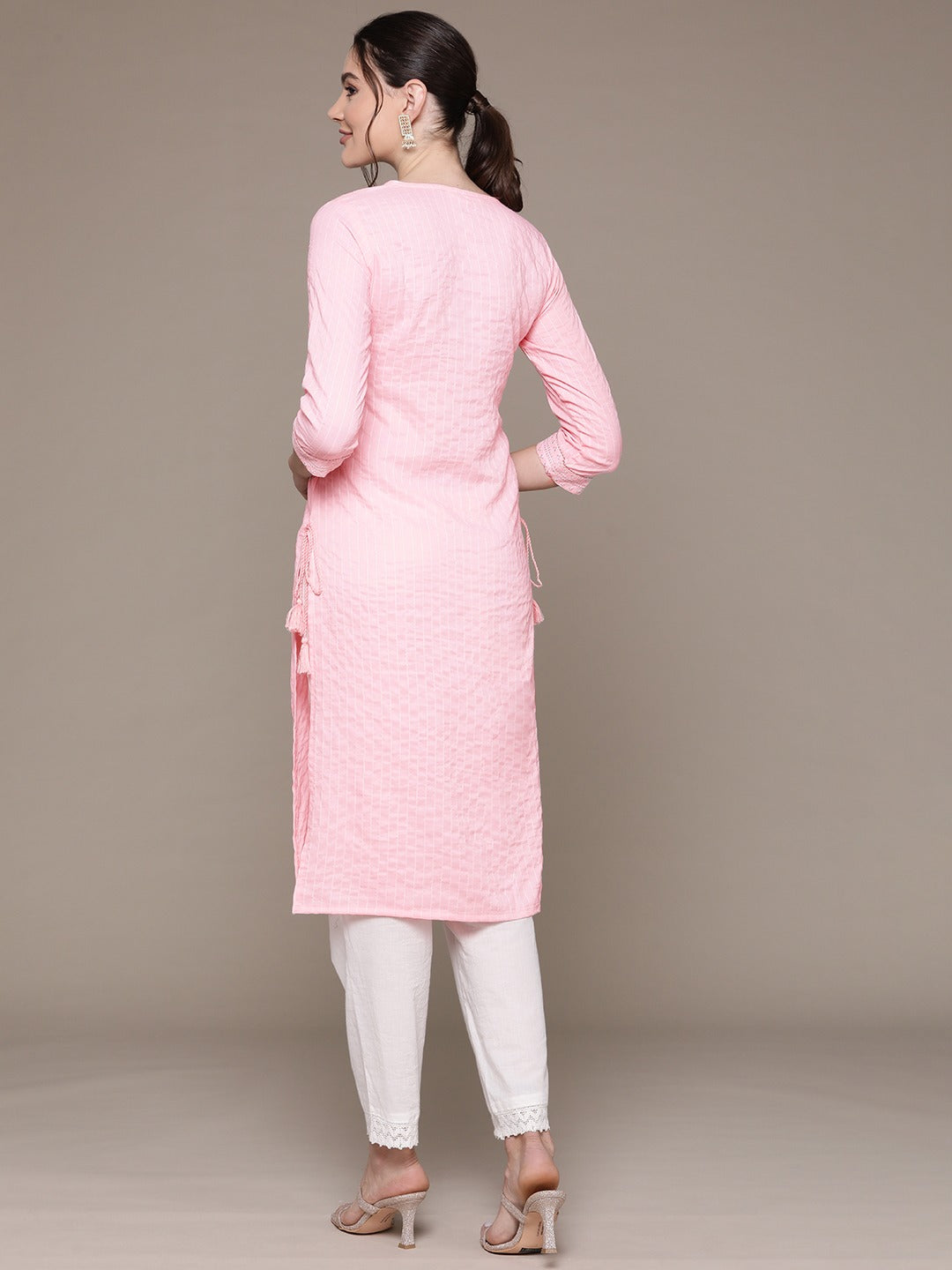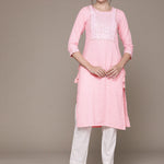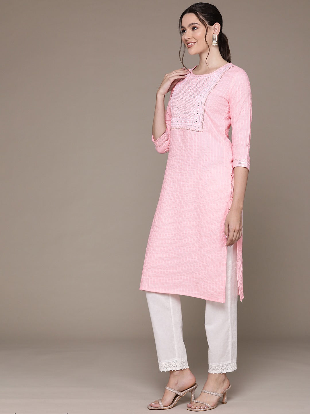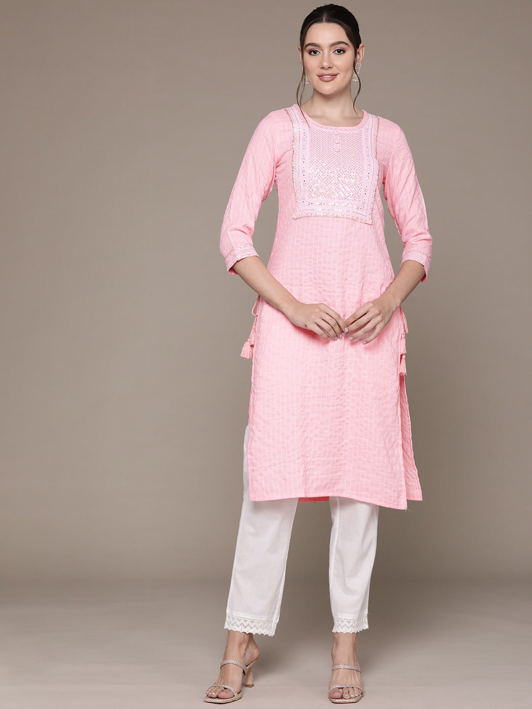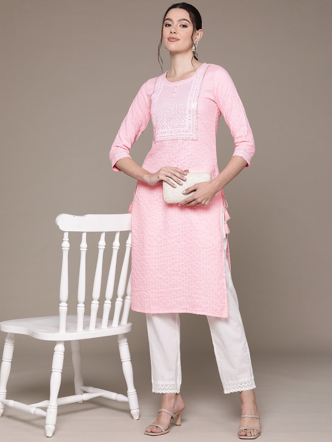 Straight Style Rayon Fabric Pink Color Kurti With Sequence & Embroidered Work