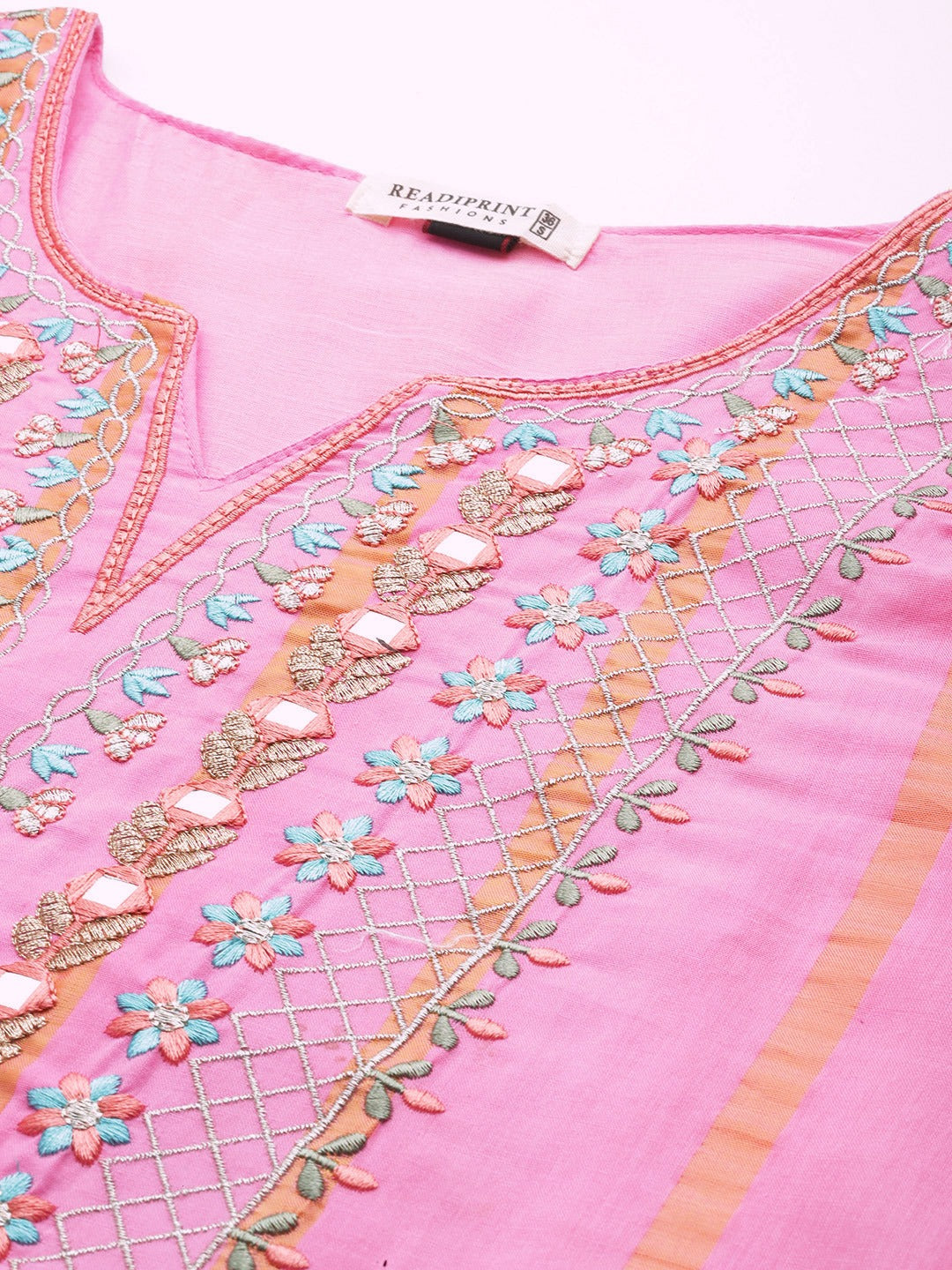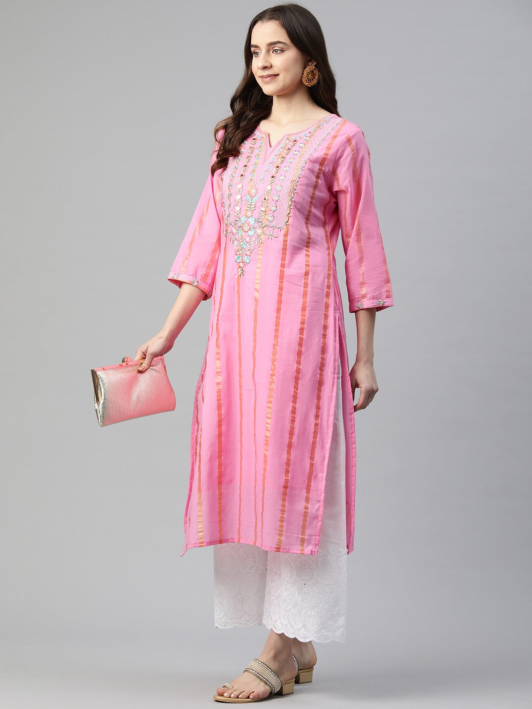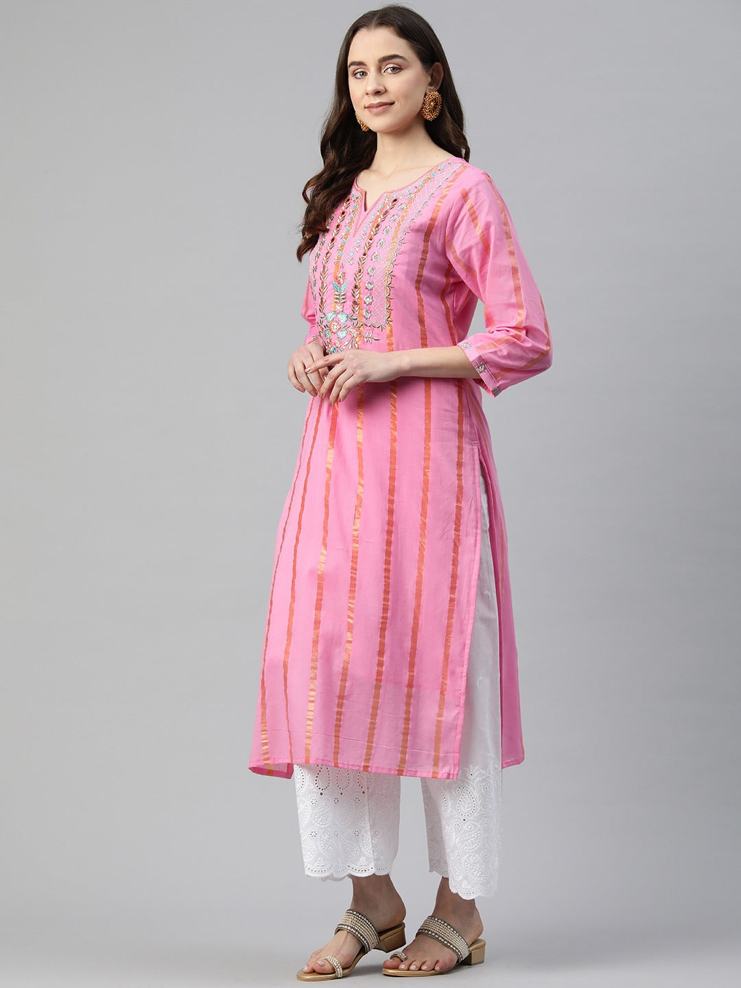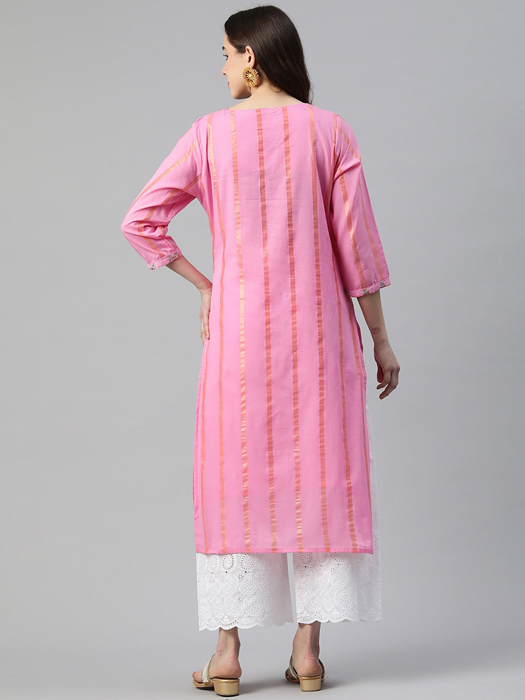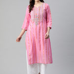 Straight Style Cotton Fabric Pink Color Kurti With Embroidered & Foil Print Work