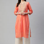 Straight Style Cotton Fabric Orange Color Kurti With Embroidered & Foil Print Work