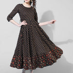 Cotton Calf Length Printed Flared 3/4 Sleeves Round Neck Kurta (Preorder)
