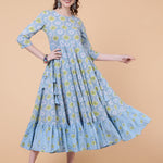 Cotton Calf Length Printed Flared 3/4 Sleeves Round Neck Kurta (Preorder)