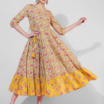 Cotton Calf Length Printed Flared 3/4 Sleeves Round Neck Kurta (Preorder)