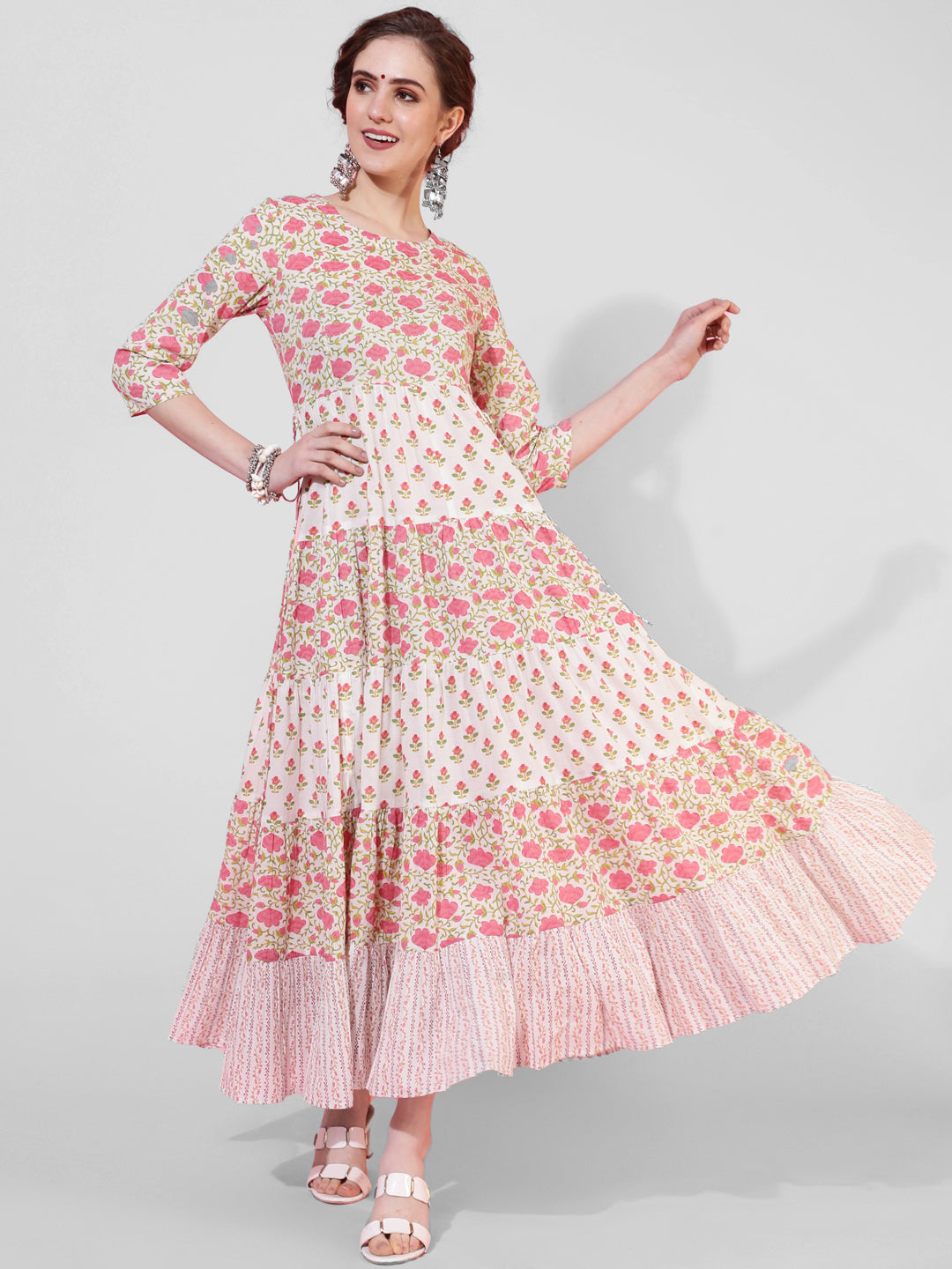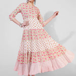 Cotton Calf Length Printed Flared 3/4 Sleeves Round Neck (Preorder)