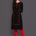 Embroidered Straight Calf Length 3/4 Sleeves Round Neck Rayon Kurta (Preorder)