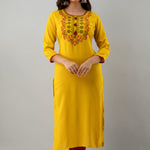 Embroidered Straight Calf Length 3/4 Sleeves Round Neck Rayon Kurta (Preorder)