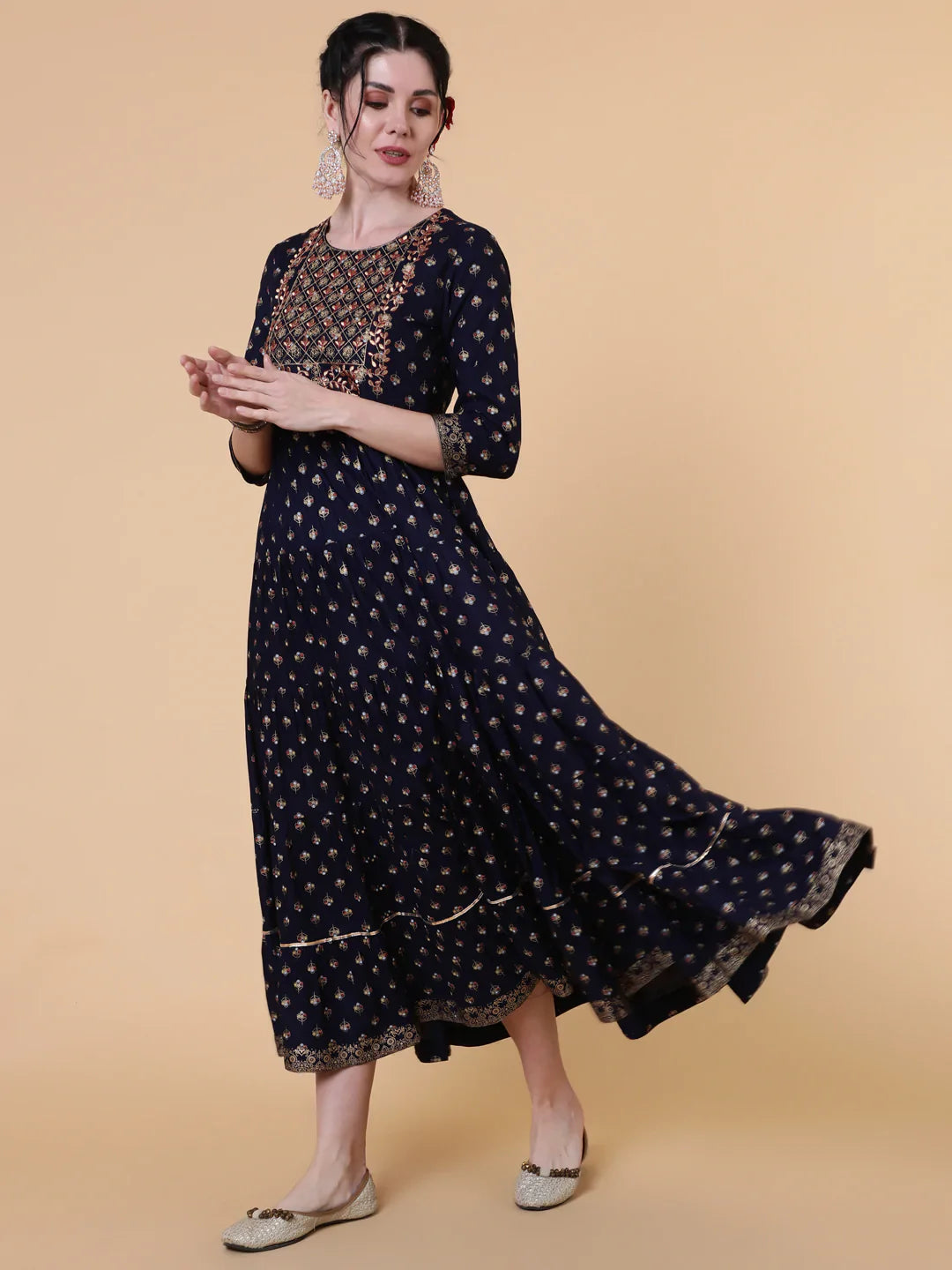 Rayon Calf Length Flared 3/4 Sleeves Printed Round Neck Kurta (Preorder)