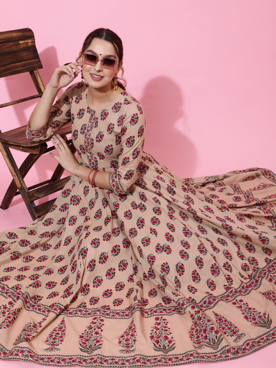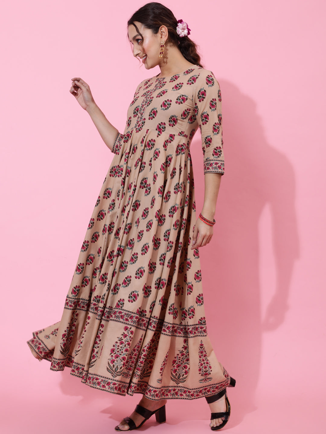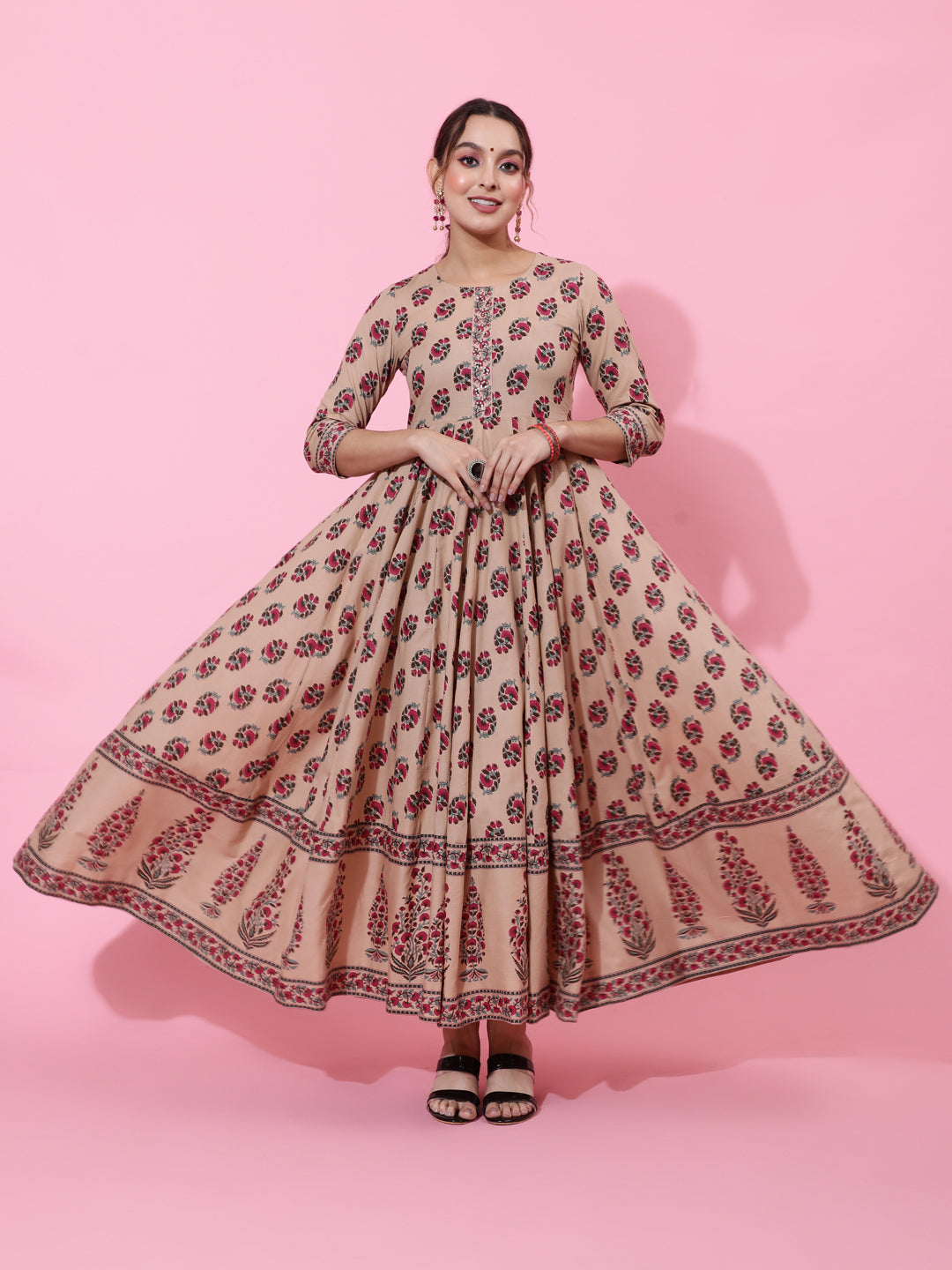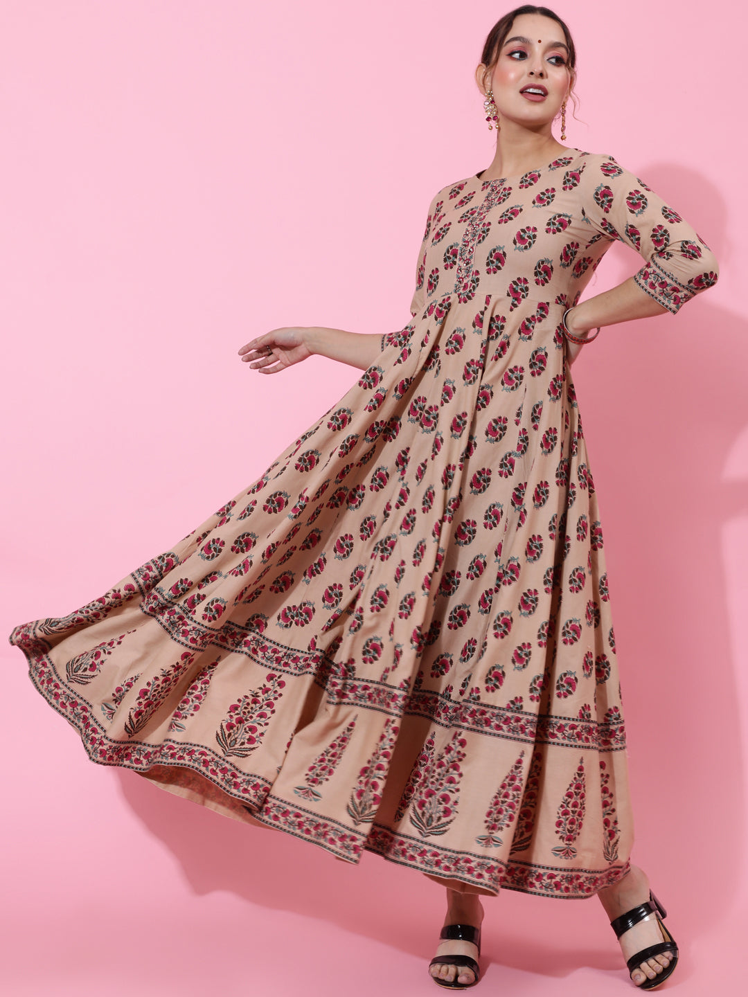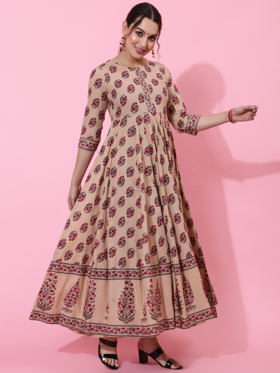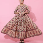 Cotton Ankle Length Printed Flared 3/4 Sleeves Round Neck Kurta (Preorder)