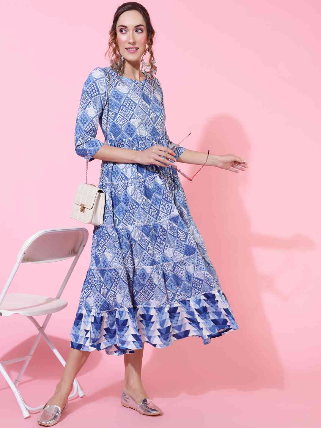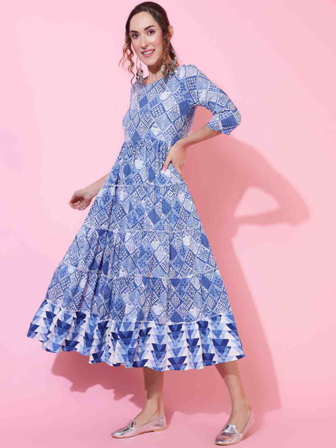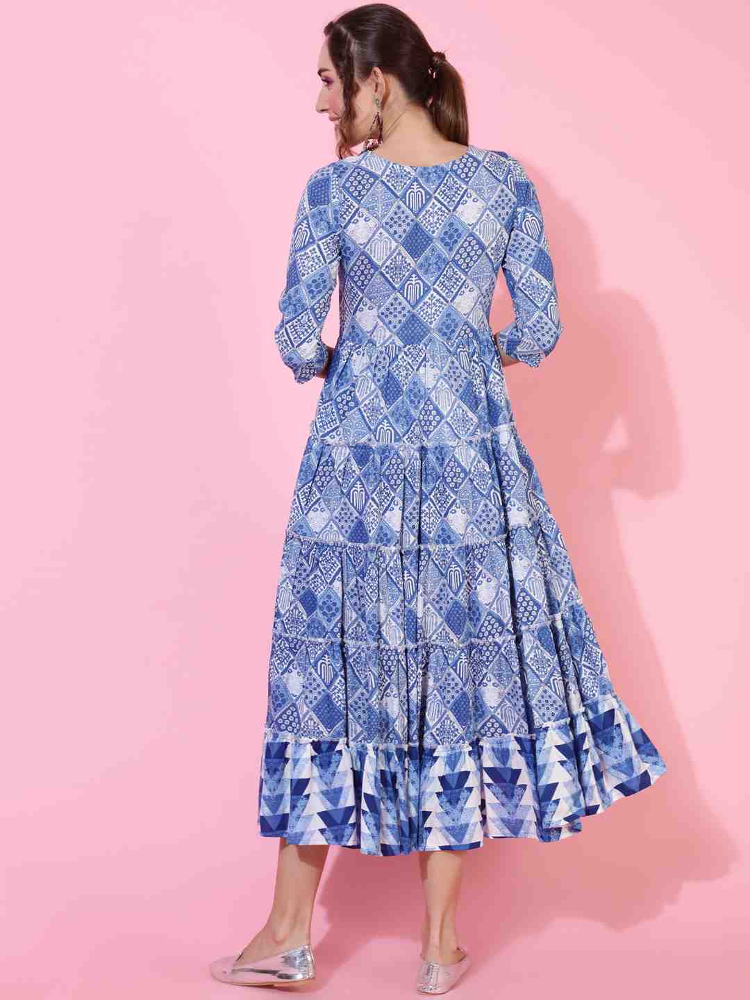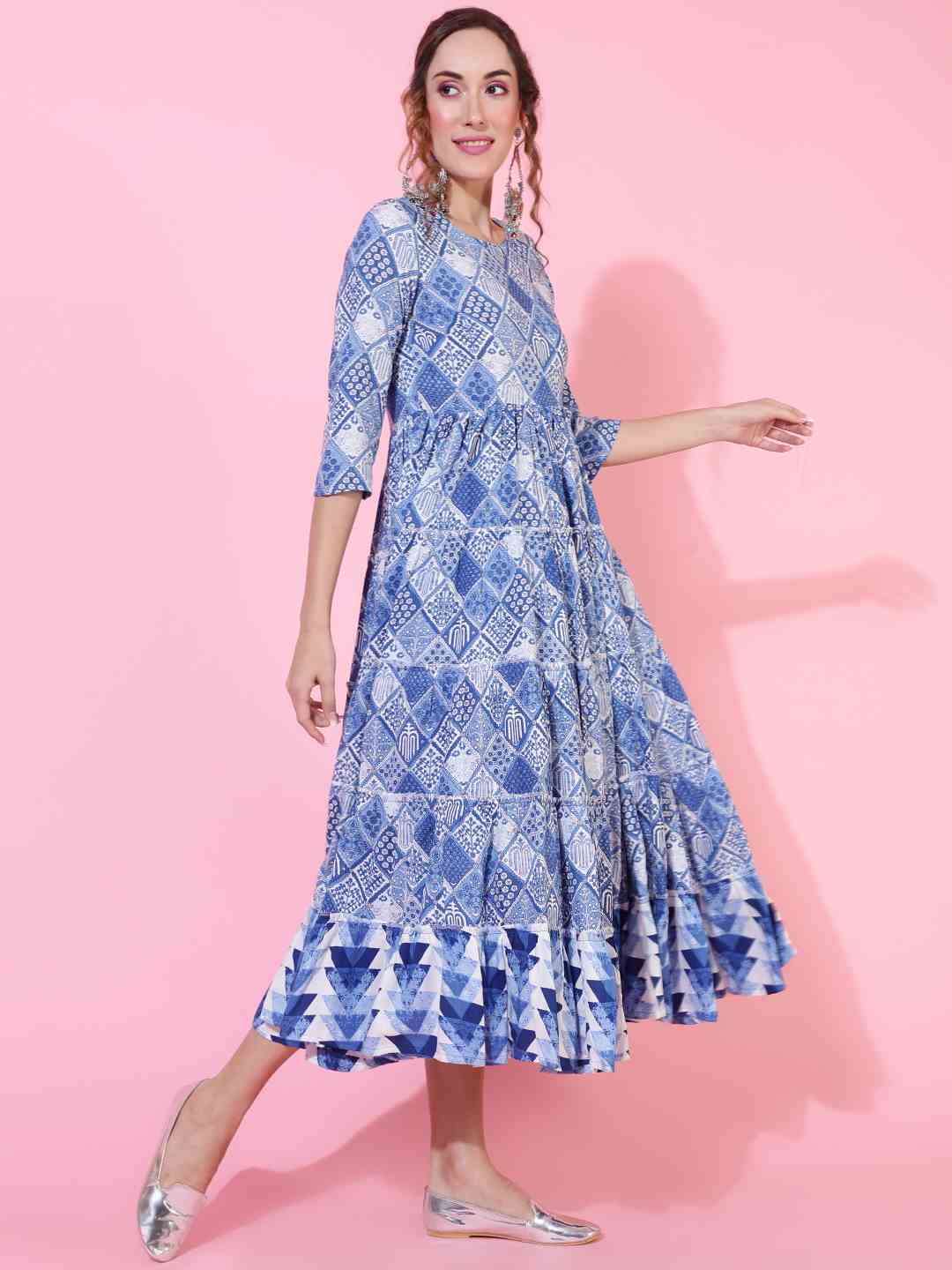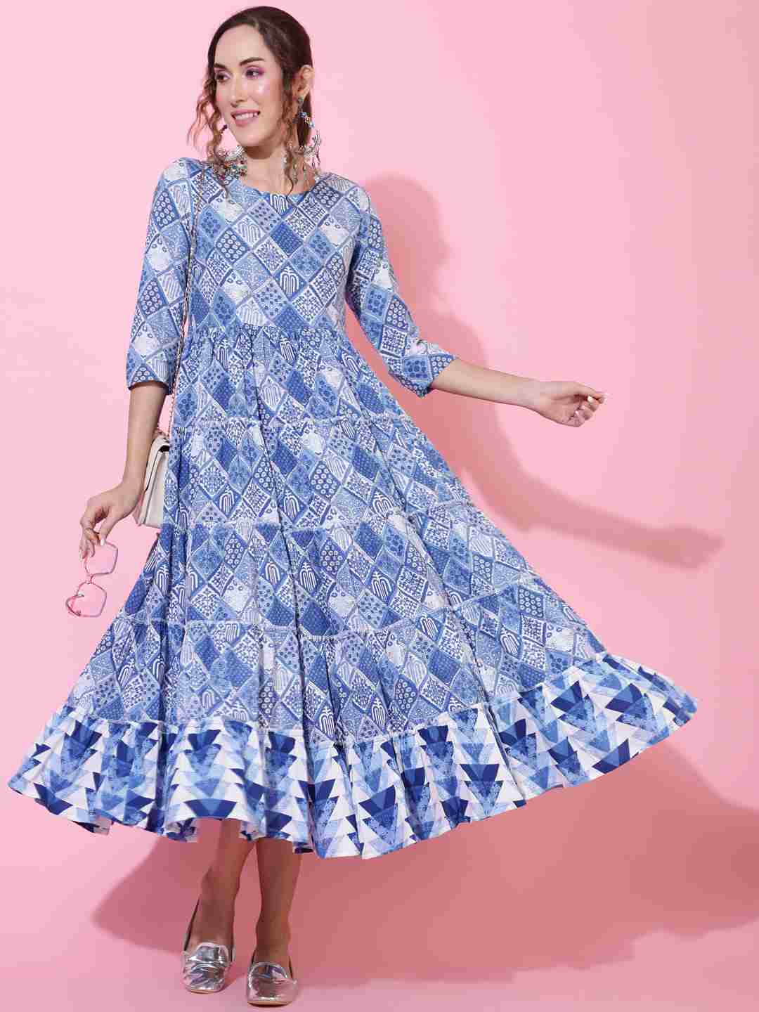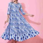 Rayon Calf Length Printed Flared 3/4 sleeves Round Neck Kurta (Preorder)