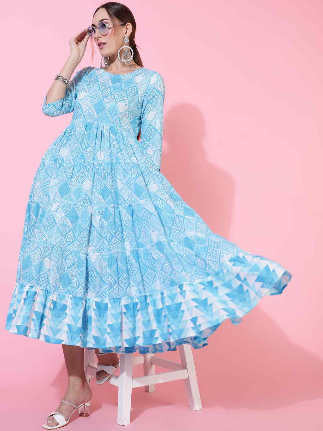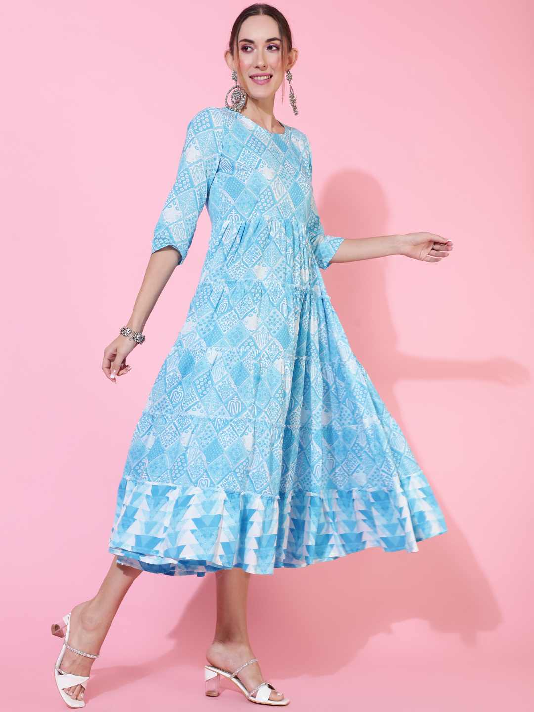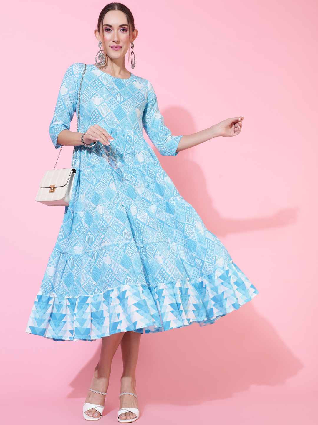 Rayon Calf Length Printed Flared 3/4 sleeves Round Neck Kurta (Preorder)