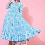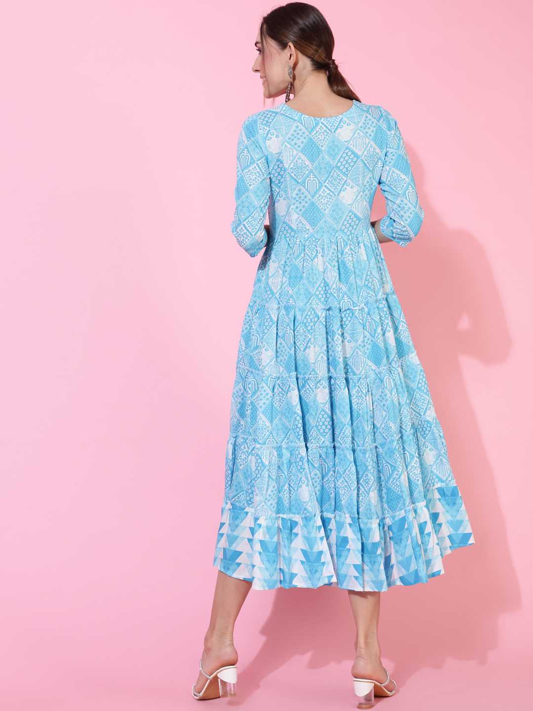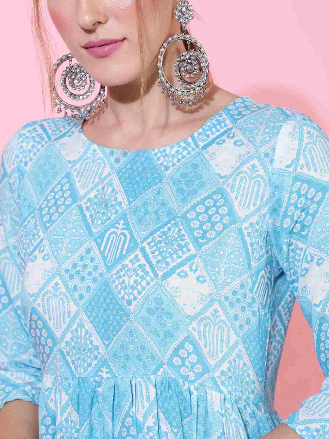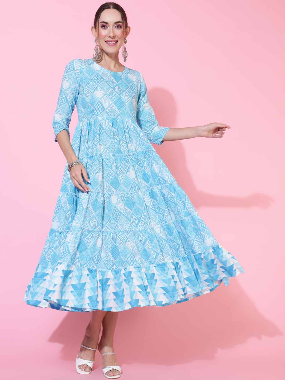 Rayon Calf Length Printed Flared 3/4 sleeves Round Neck Kurta (Preorder)