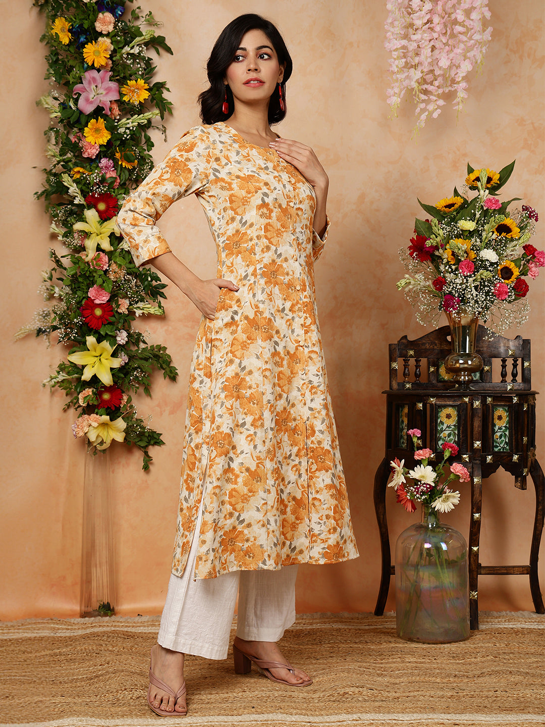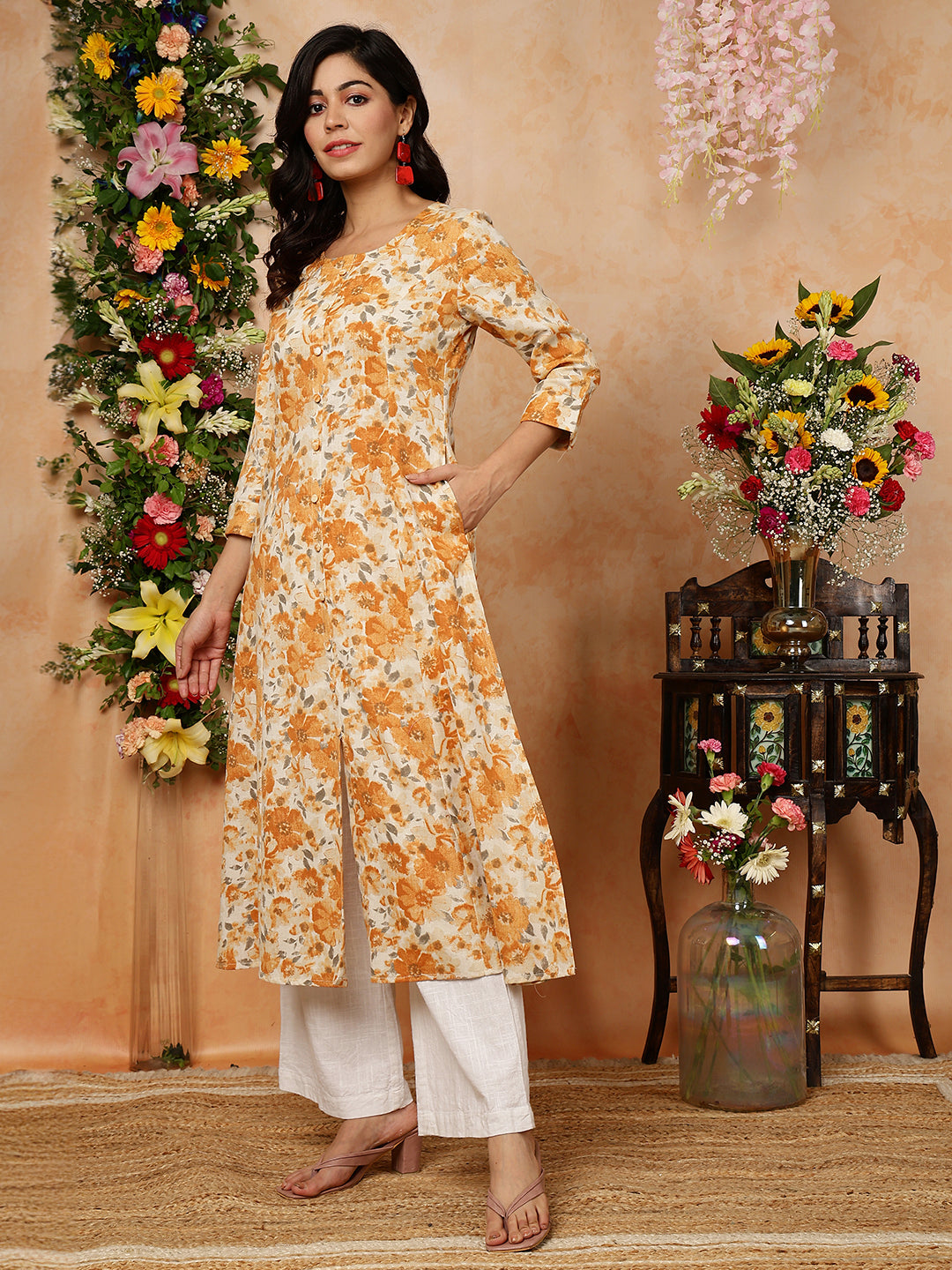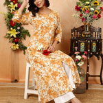 Cotton Flex Calf Length Printed A-Line 3/4 Sleeves Round Kurta (Preorder)