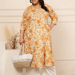 Cotton Flex Flex Calf Length Printed Straight 3/4 Sleeves Round Kurta (Preorder)