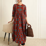 Cotton Calf Length Printed Semi-Flared 3/4 Sleeves Round Neck Kurta (Preorder)
