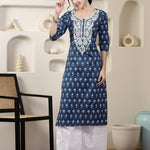 Indigo Blue Printed & Embroidered Cotton Straight Chicken Kurta (Pre-Order)