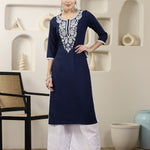 Navy Solid & Embroidered Rayon Straight Chicken Kurta (Pre-Order)