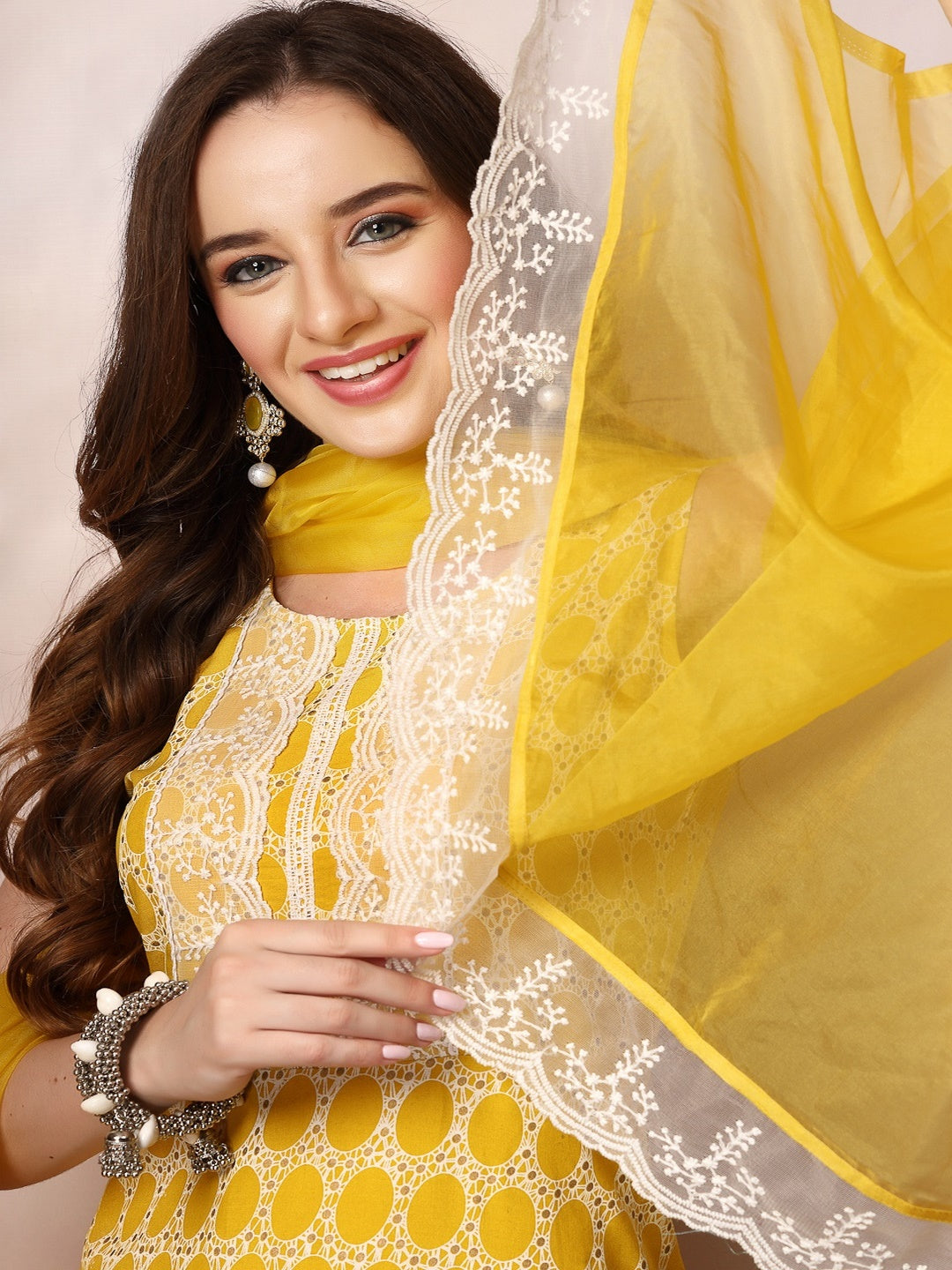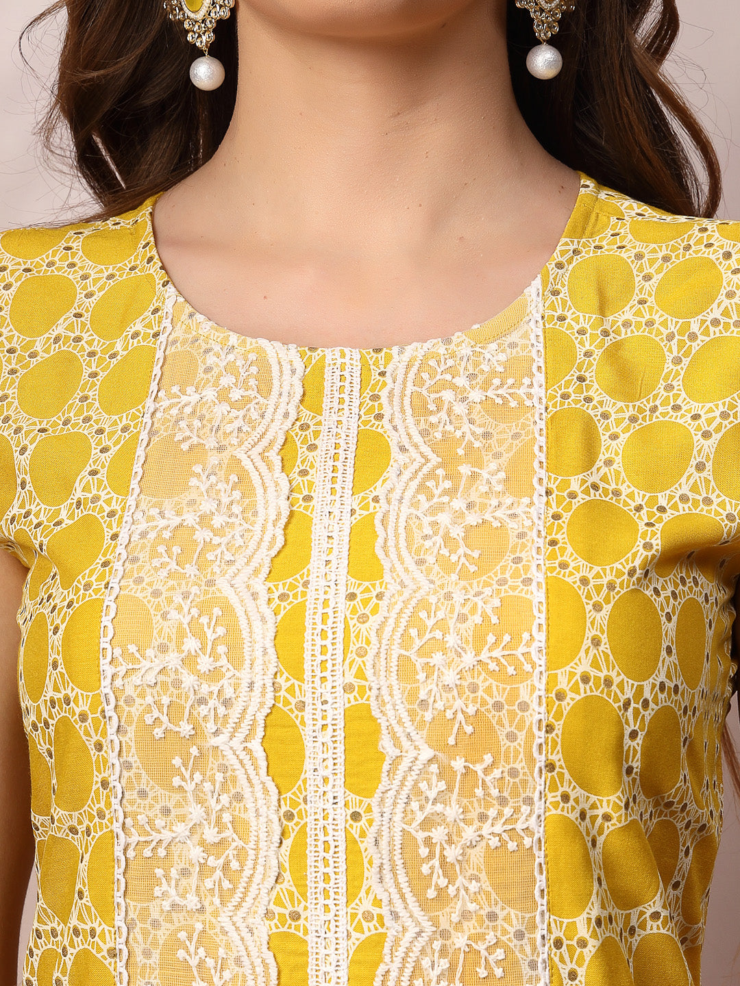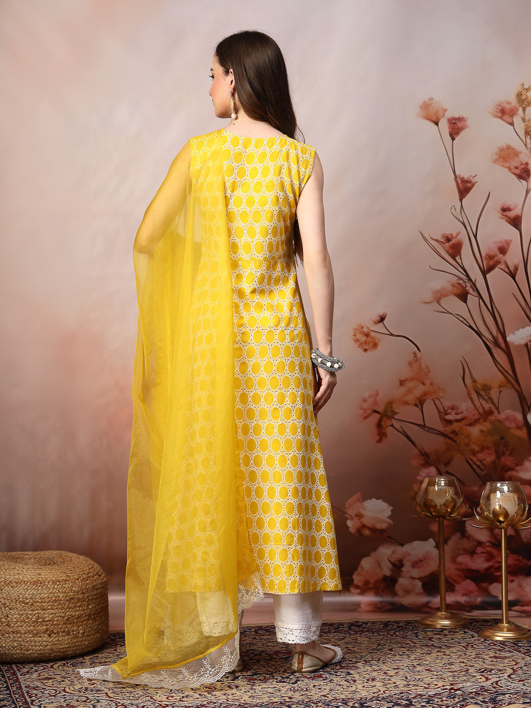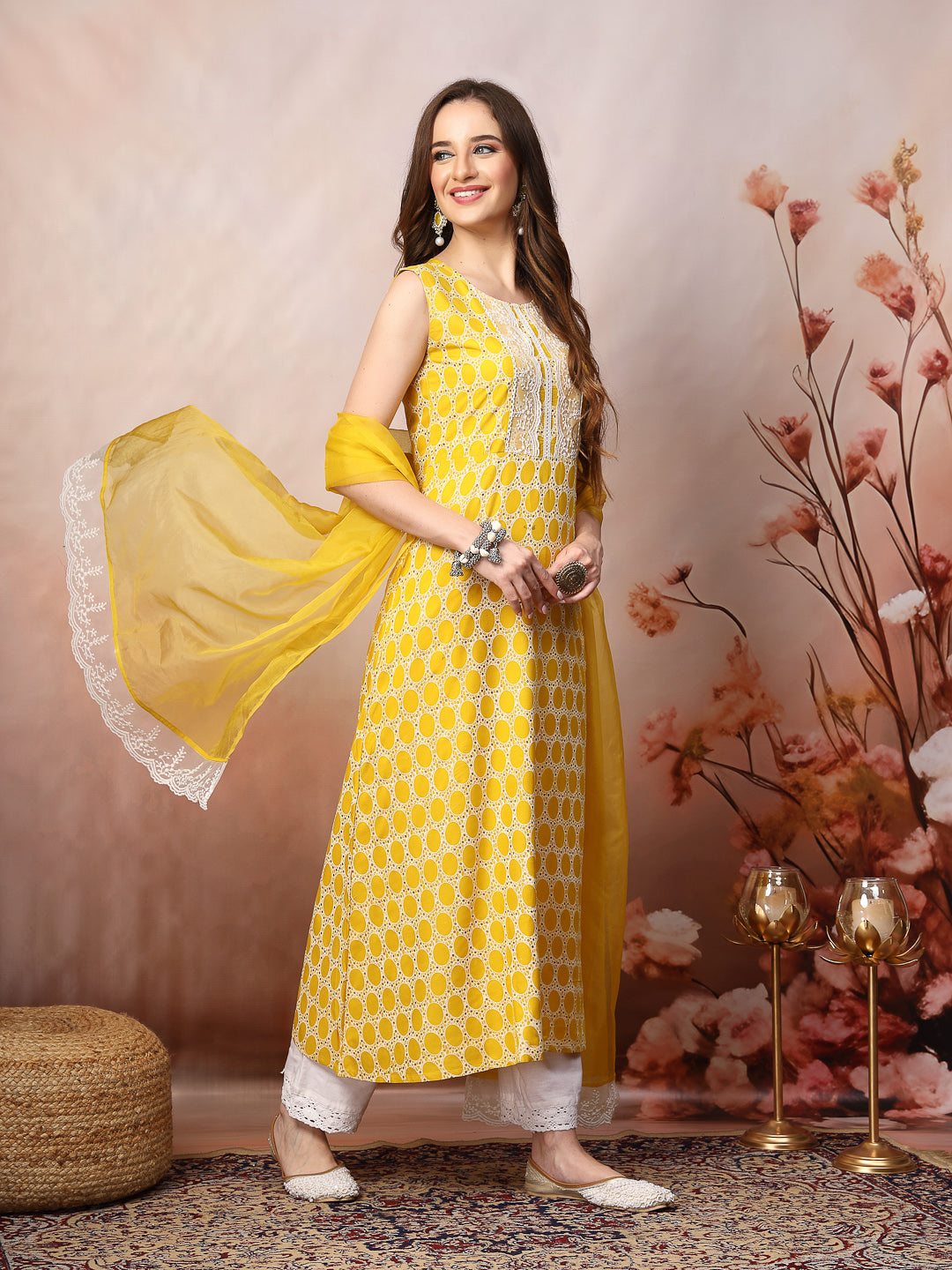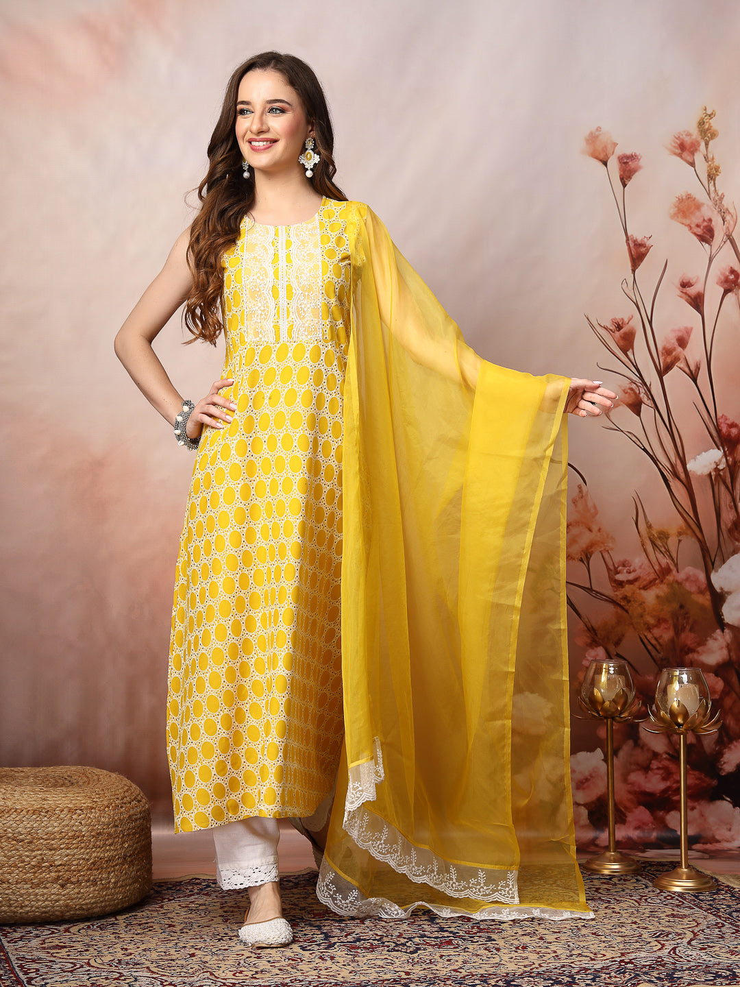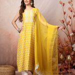Yellow Printed & Embroidered Rayon A-Line Kurta Dupatta Set (Pre-Order)