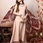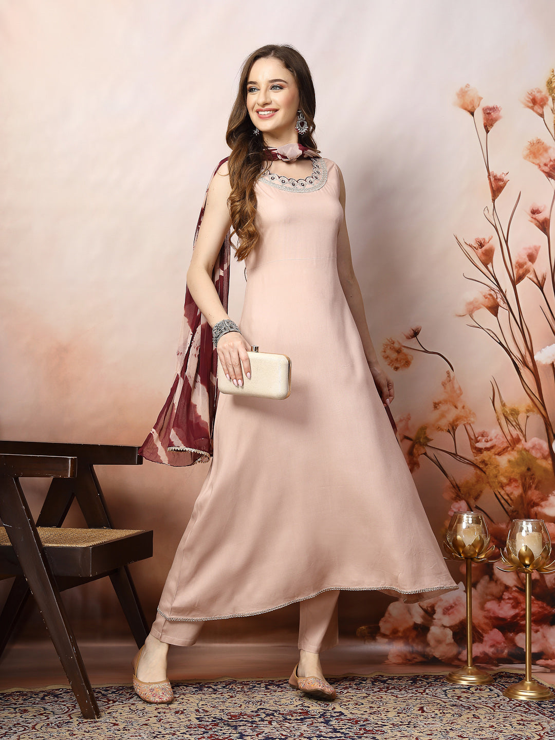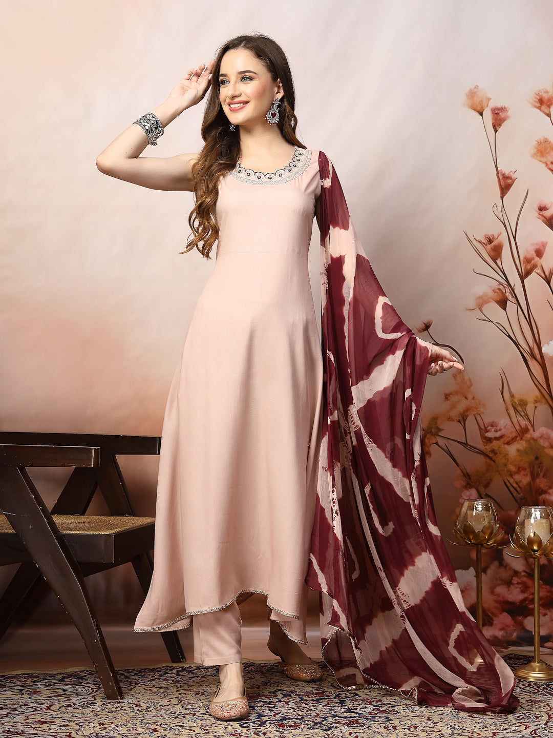 Rose Gold Solid & Embroidered Rayon A-Line Kurta Dupatta Set (Pre-Order)