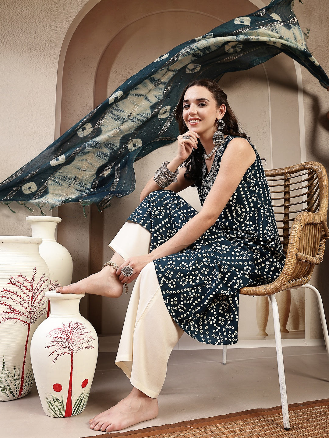 Teal Bandhej Printed A-Line Rayon Kurta With Dupatta (Pre-Order)