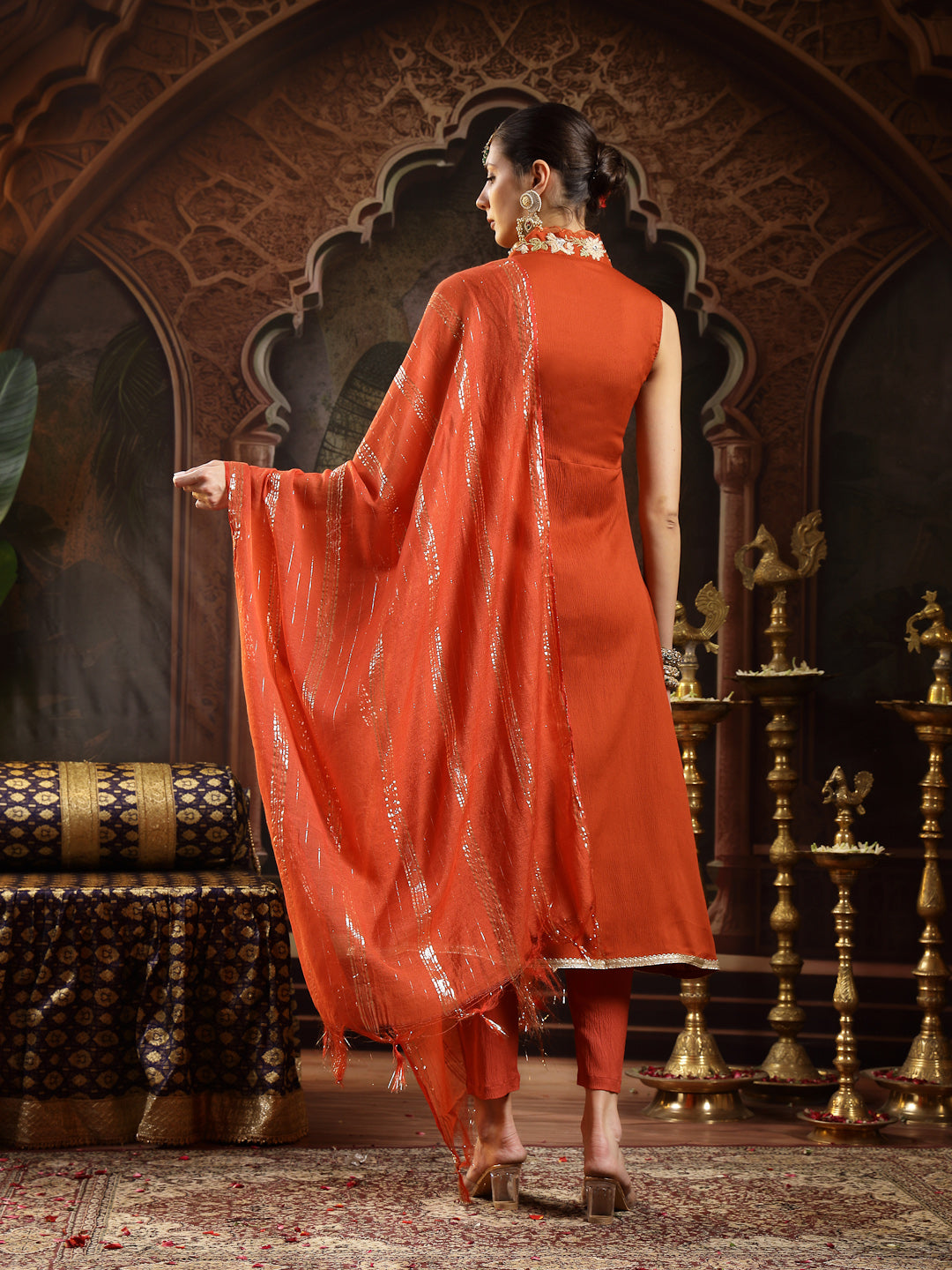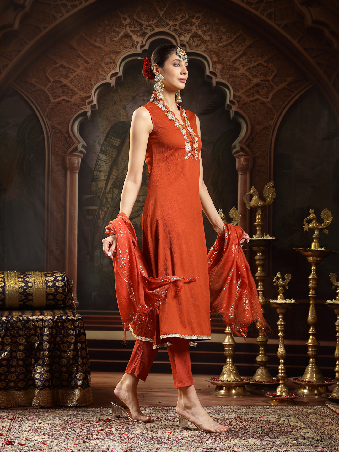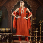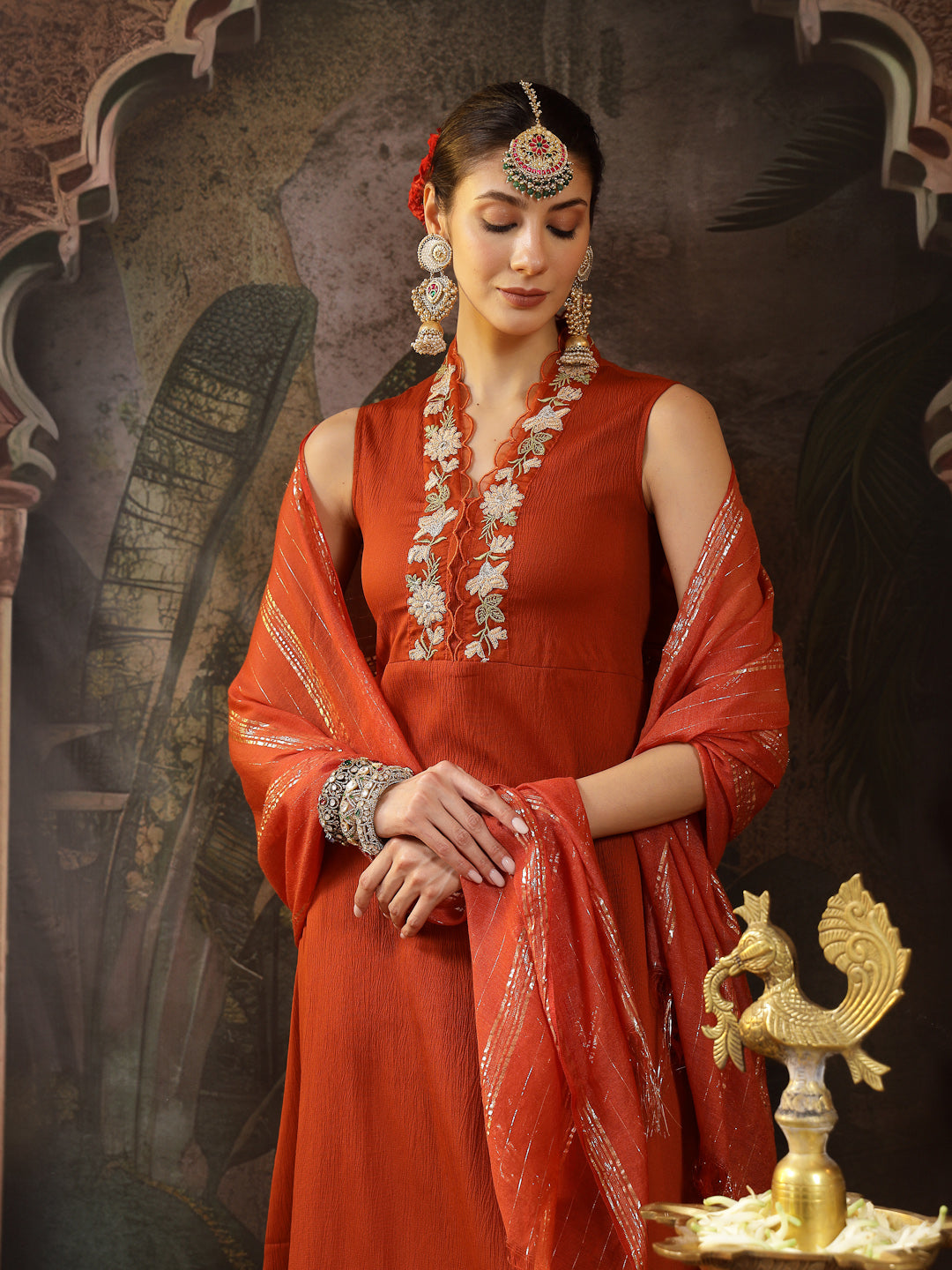 Rust Solid & Embroidered Crepe A-Line Kurta With Dupatta (Pre-Order)