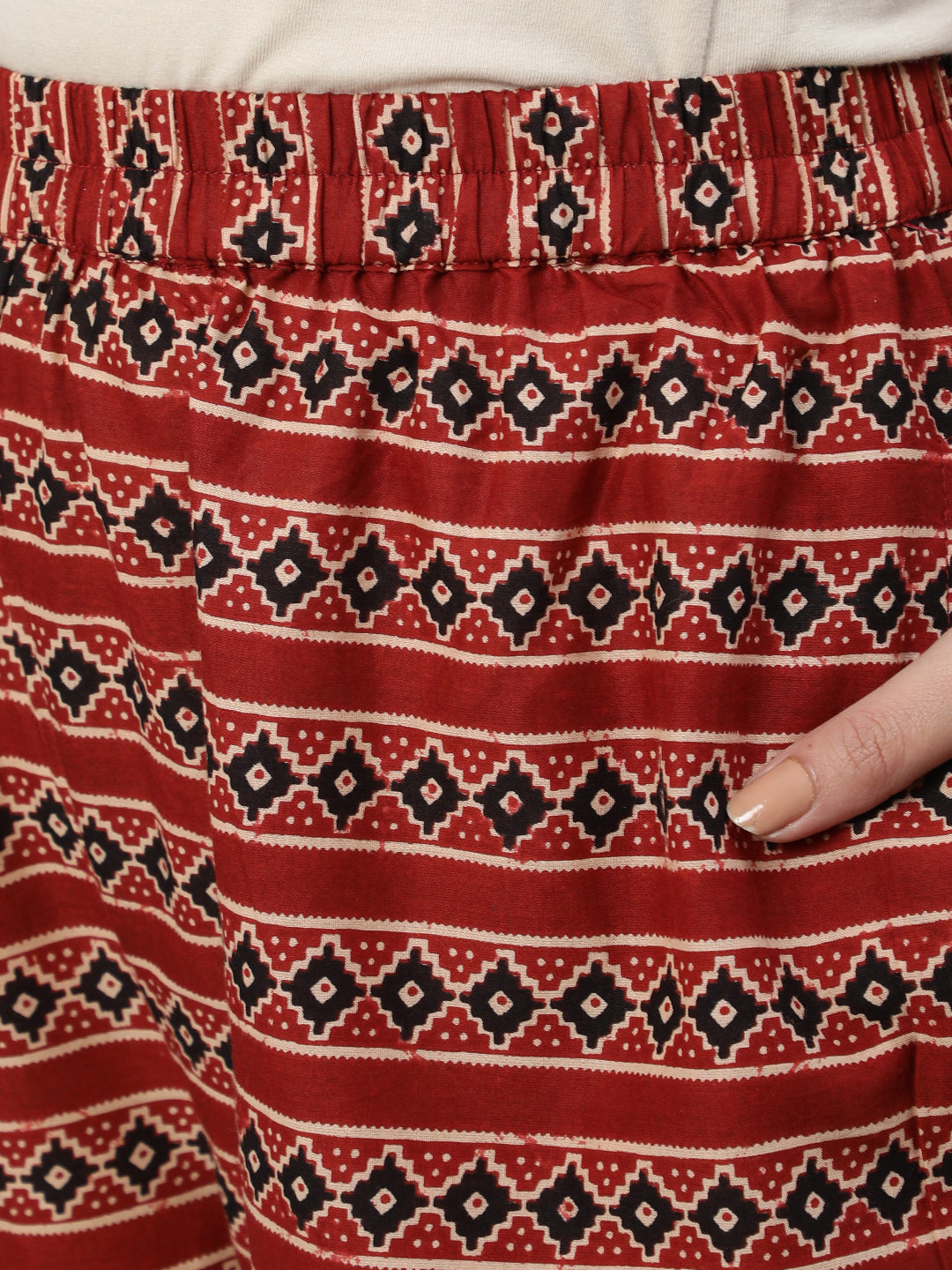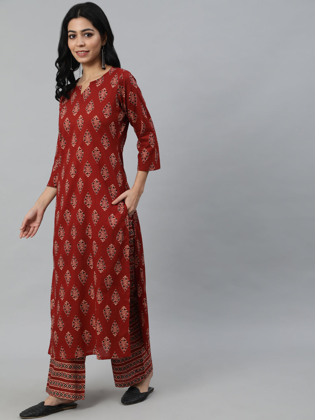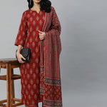 Women Maroon Printed Straight Kurta With Plazo & Dupatta