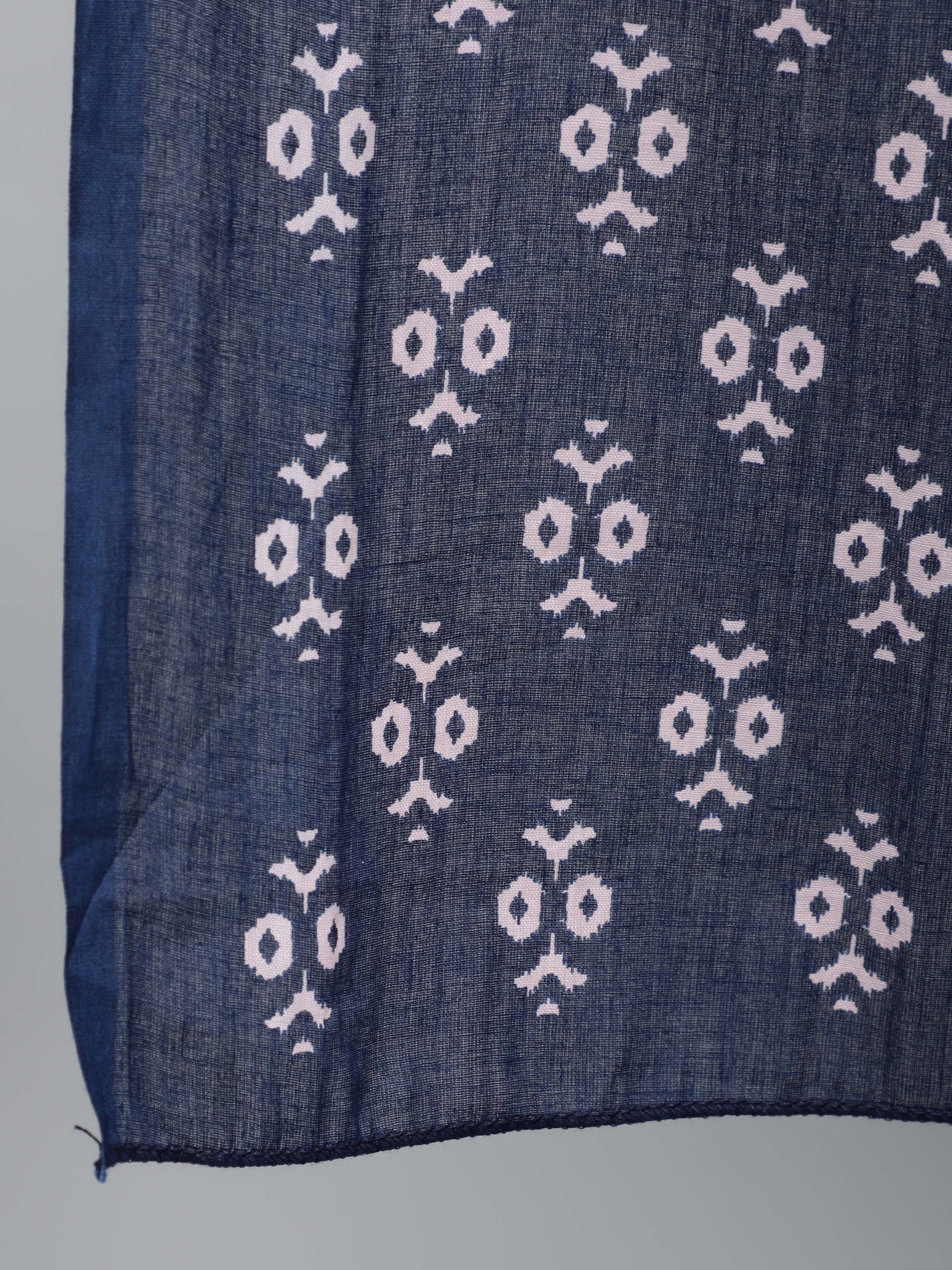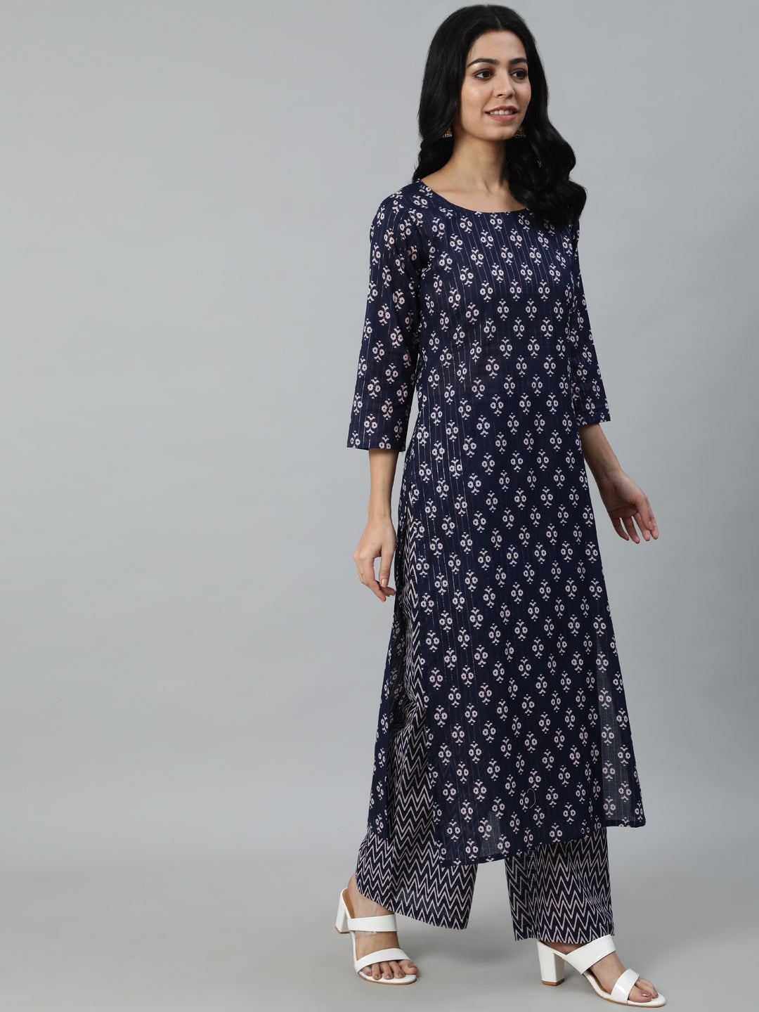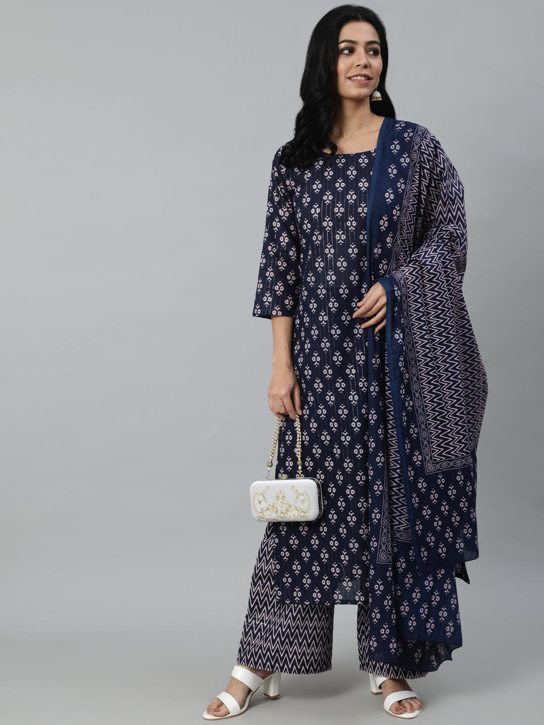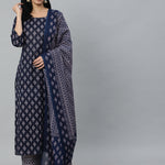 Women Navy Blue Printed Straight Kurta With Plazo & Dupatta