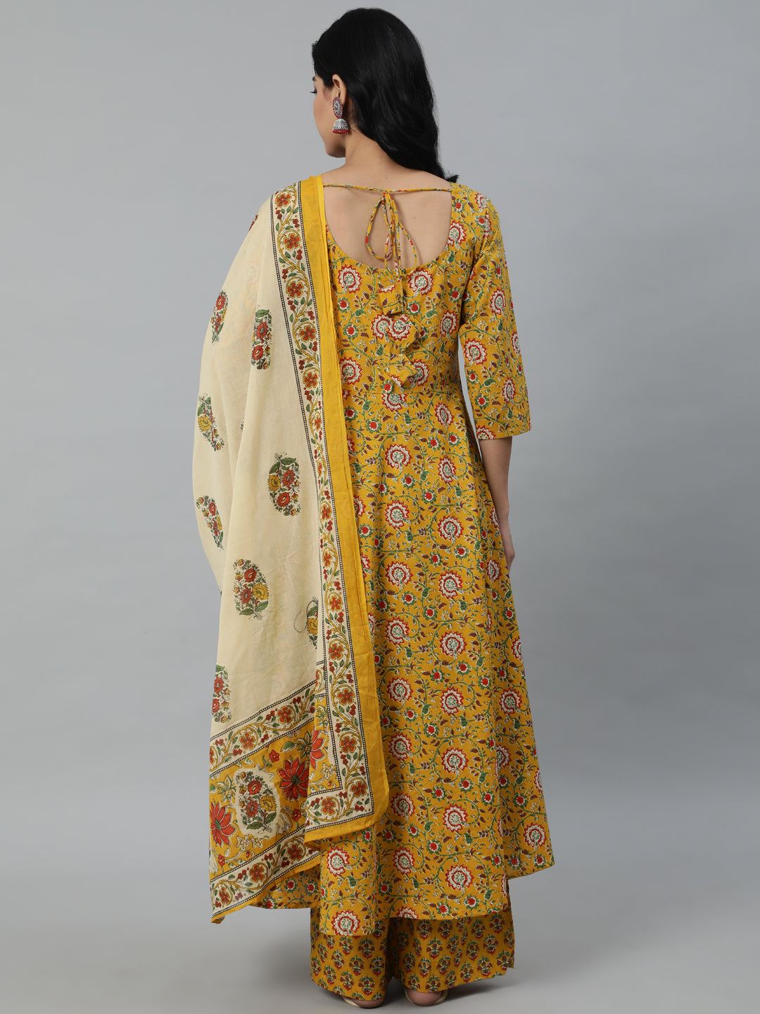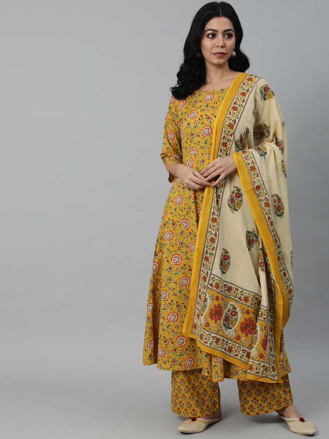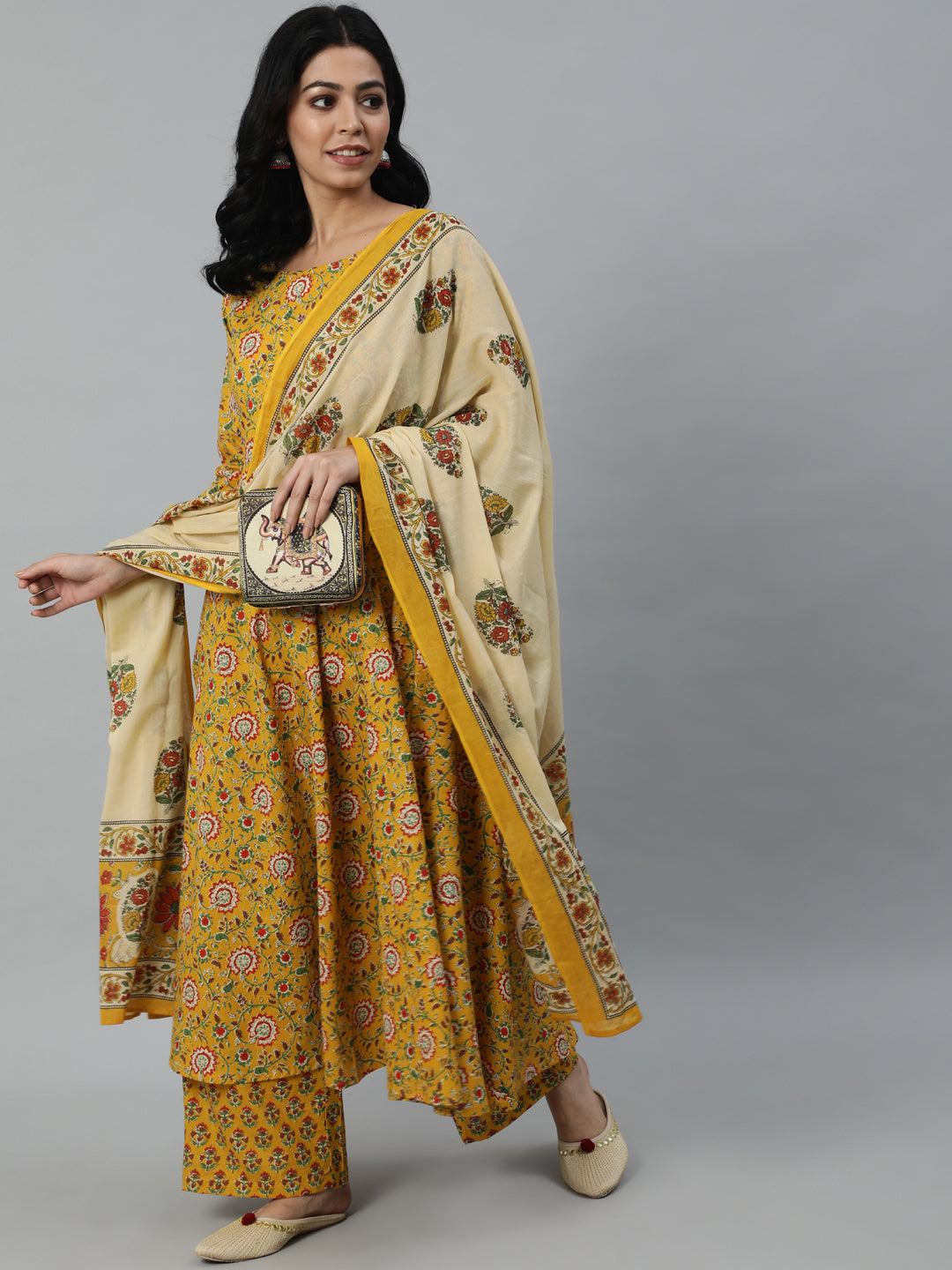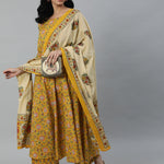 Women Mustard Printed Flared Kurta With Trouser & Dupatta