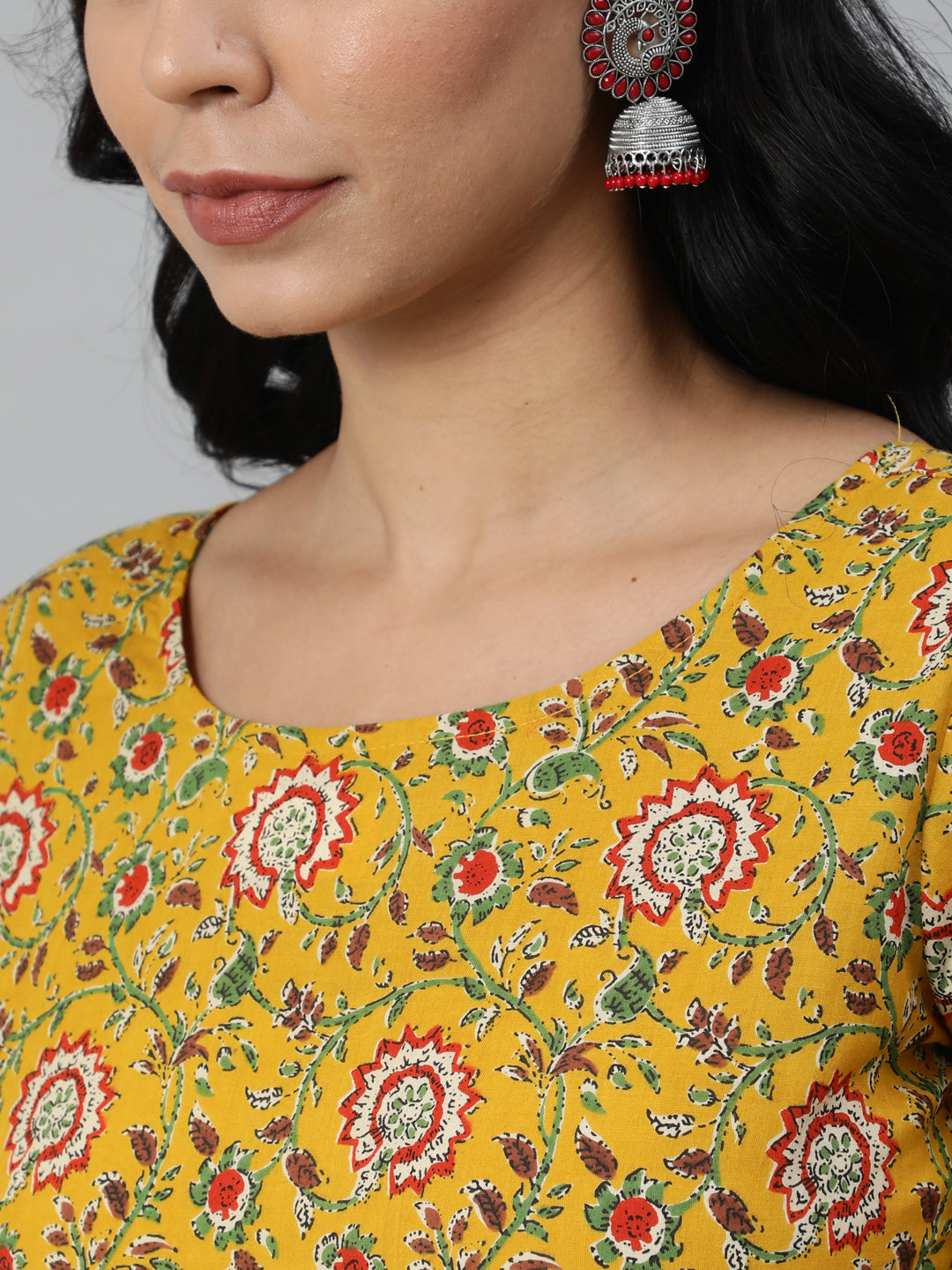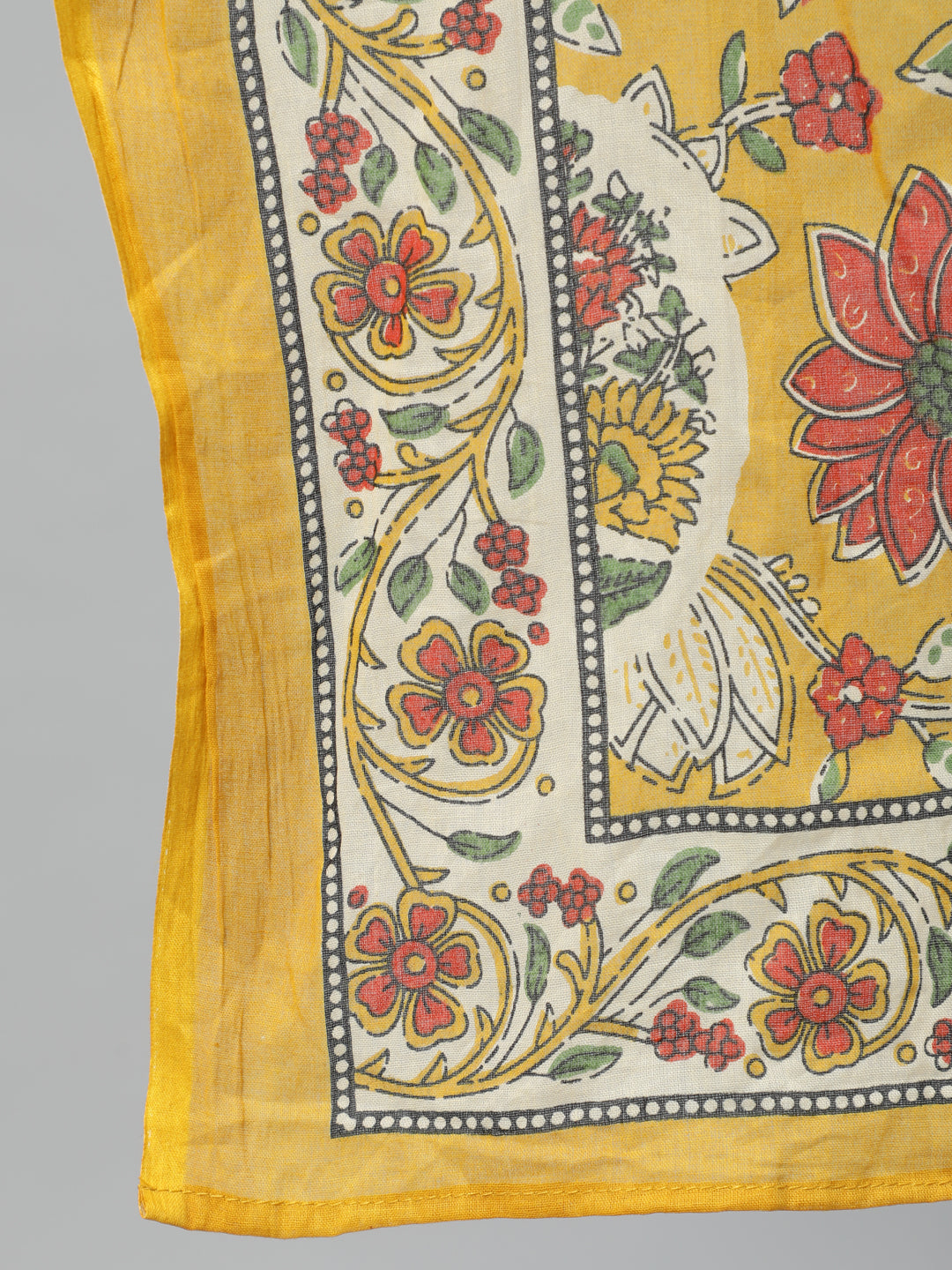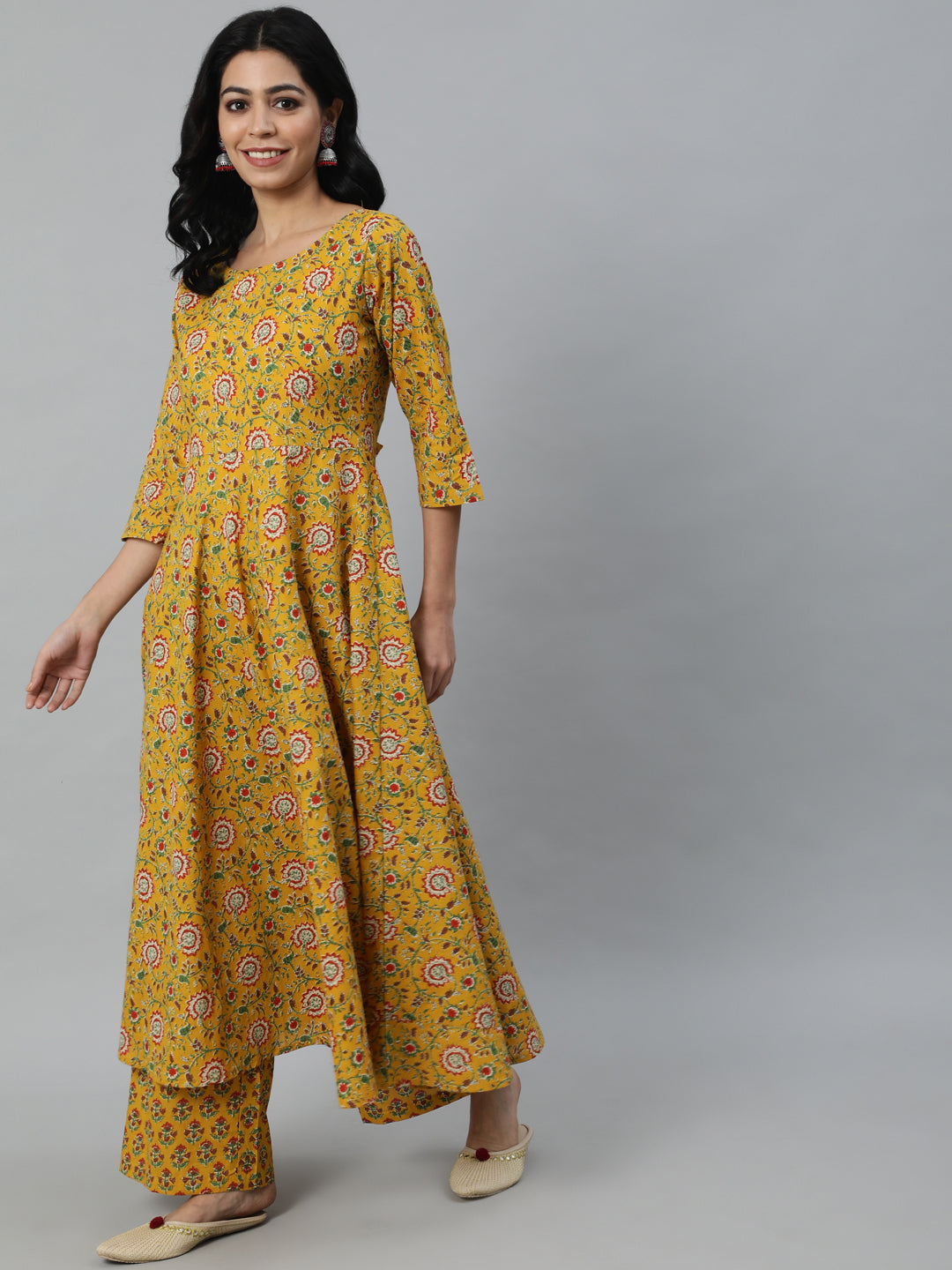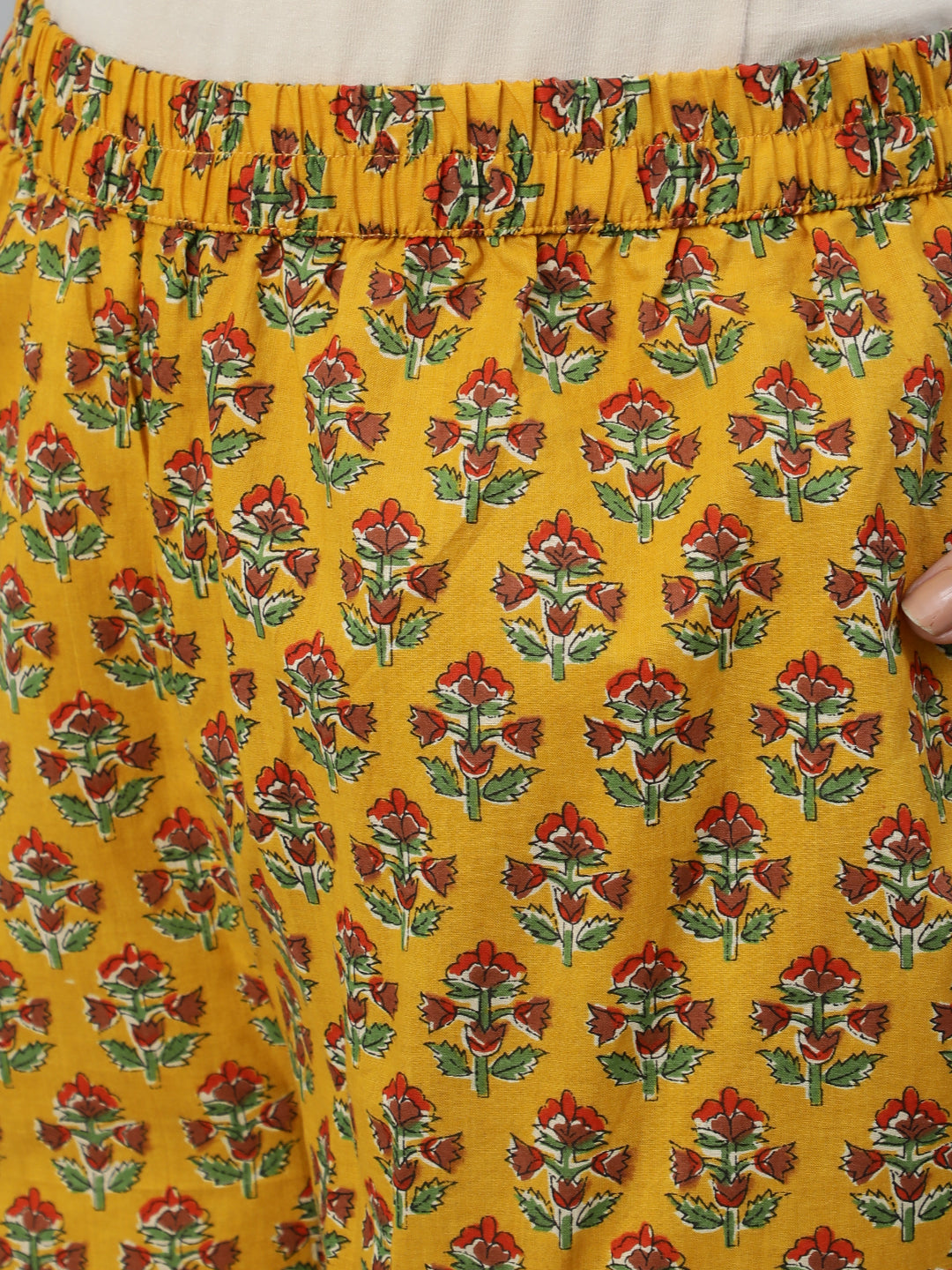 Women Mustard Printed Flared Kurta With Trouser & Dupatta