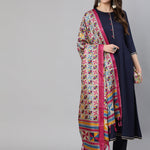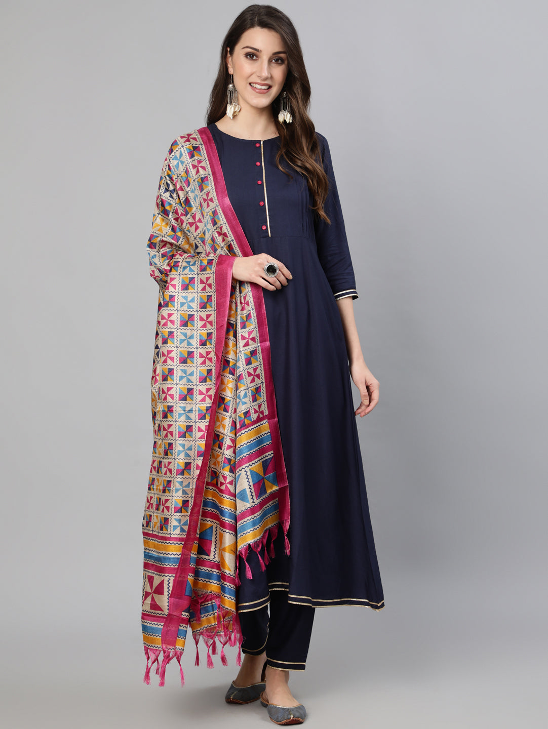 Women Navy Blue Solid Gathered Kurta With Troiuser And Sequance Dupatta