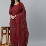 Women Maroon Striped Straight Kurta With Plazo & Dupatta