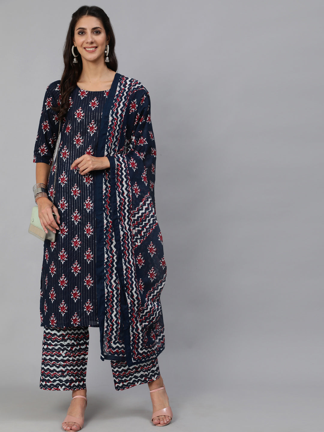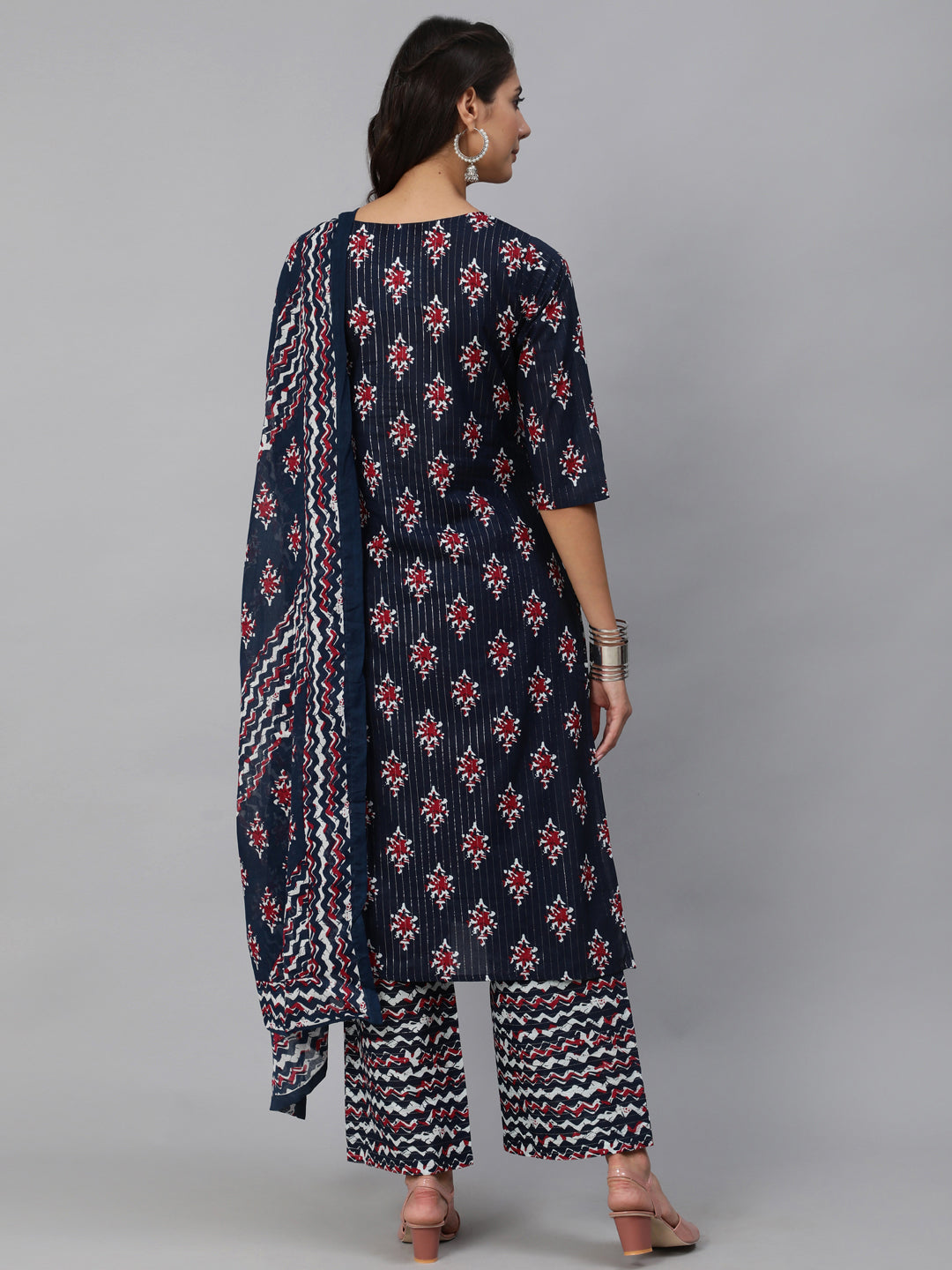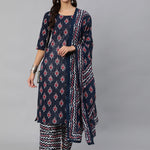 Women Navy Blue Ethnic Printed Squance Kurta And Plazzo With Dupatta
