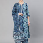 Women Blue Printed Straight Kurta With Plazo & Dupatta