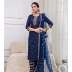 Navy Blue Gold Printed Straight Kurta Set With Net Dupatta