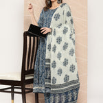 Blue Printed Flared Kurta And Trouser With Dupatta