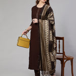 Dark Brown Straight Kurta With Palazzo And Art Silk Dupatta