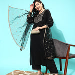 Black Embroidered Straight Kurta With Palazzo And Net Dupatta
