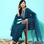 Teal Blue Embroidered Straight Kurta With Palazzo And Net Dupatta