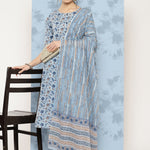 Blue Floral Printed A-Line Kurta With Palazzo And Dupatta