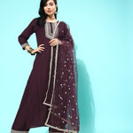 Dark Purple Embroidered Straight Kurta With Palazzo And Net Dupatta