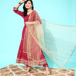 Maroon Printed Anarkali Kurta With Trouser And Dupatta