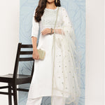 White Embroidered Straight Kurta With Palazzo And Net Dupatta