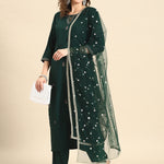 Women Green Embroidered Straight Kurta With Palazzo And Net Dupatta