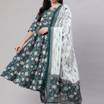 Women Green Floral Printed Anarkali Kurta With Trouser And Dupatta