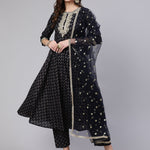 Navy Blue Embroidered Flared Kurta With Trouser And Dupatta