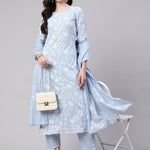 Blue Ethnic Printed Straight Kurta With Trouser And Dupatta