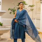 Blue Printed Straight Kurta With Trouser And Dupatta