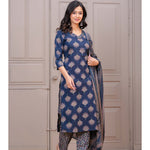 Navy Blue Printed Straight Kurta Set With Dupatta
