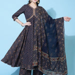 Cotton Calf Length Printed Semi-Flared 3/4 Sleeves Sweetheart Neck Kurta Bottom Dupatta Set