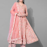 Cotton Calf Length Printed Flared 3/4 Sleeves V-Neck Kurta Bottom Dupatta Set