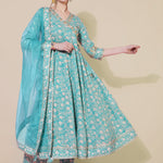 Cotton Calf Length Printed Flared 3/4 Sleeves V-Neck Kurta Bottom Dupatta Set